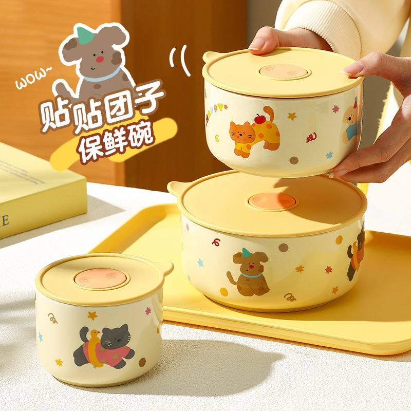陶器製保存容器セット 寮用インスタントラーメンボウル 食器ギフトボックス 漫画風ボウル 蓋付き 学生向け 可愛い キュートな漫画風