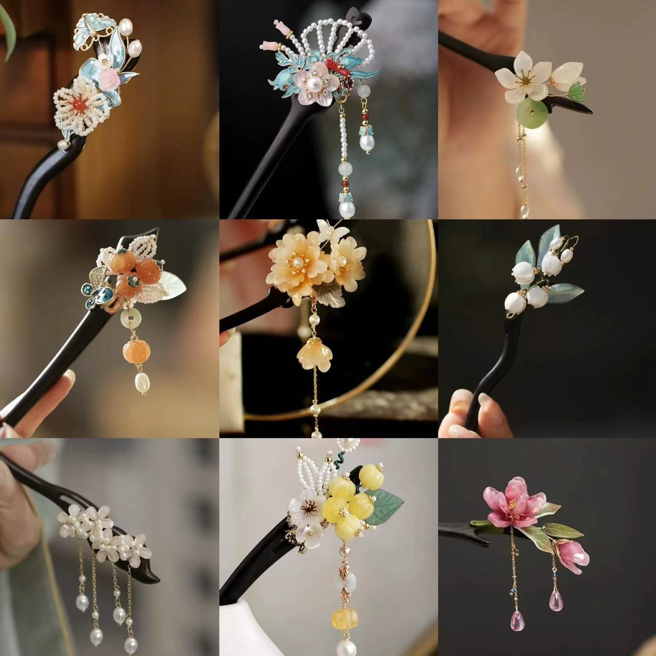 U型ヘアピン瑠璃白玉蘭盤髪かんざし新中国式ヘアピン頭飾り森系超仙チャイナドレス国風飾り