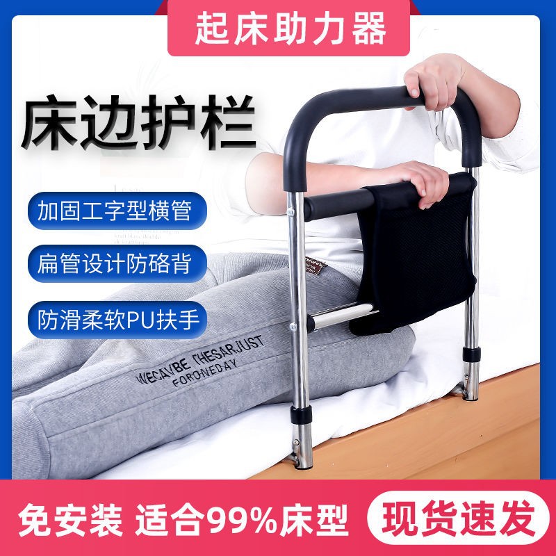 老人が起きて補助器のベッドの上で手すりをします。
