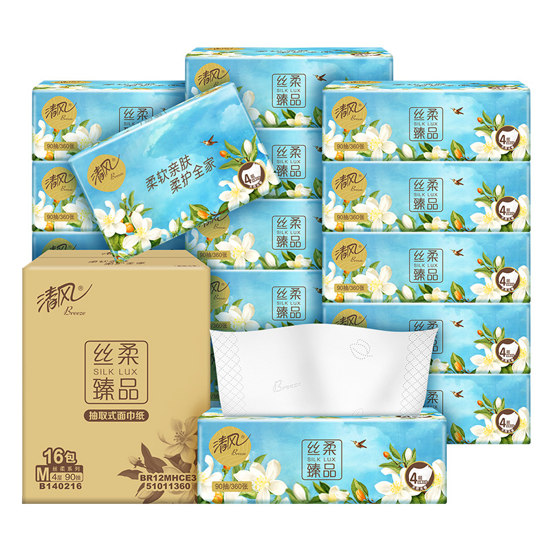 清风花萃丝柔抽纸4层90抽餐巾纸面巾纸擦手纸16包/箱M码BR12MHCE3