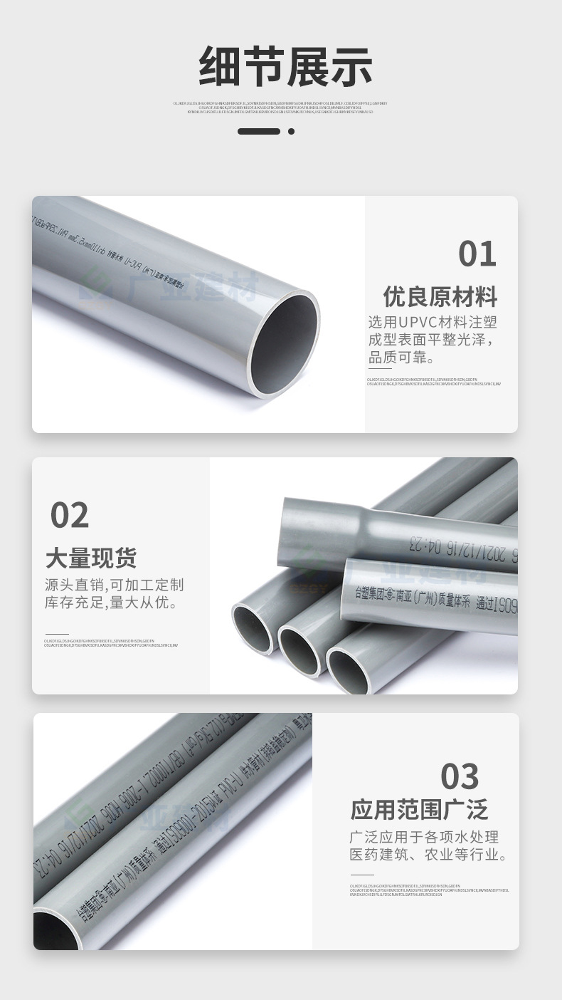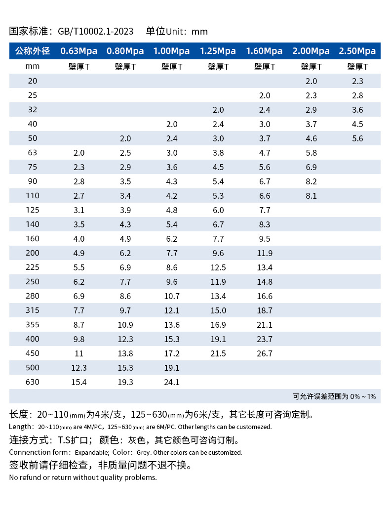 台湾プラスチック南亜ブランドの広東省総代理店です。お気軽にカスタマーサービスまでお問い合わせください。,外径20×2.0mm - 2.0MPa(4m本/本),外径20×2.3mm - 2.5MPa(4m本/本),外径25×2.0mm - 1.6MPa (4m本/本),外径25×2.8mm - 2.5MPa(4m本/本),外径 32x2.0mm - 1.25MPa (4m 個/個),外径32×2.4mm - 1.6MPa(4m本/本),外径40×2.0mm - 1.0MPa(4m/本),外径40×2.4mm - 1.25MPa(4m本/本),外径40×3.0mm - 1.6MPa(4m本),外径50×2.0mm - 0.8MPa(4m本/本),外径50×2.4mm - 1.0MPa(4m本),外径 50x3.0mm - 1.25MPa (4m 個/個),外径50×3.7mm - 1.6MPa(4m/本),外径63×2.5mm - 0.8MPa(4m本/本),外径63×3.0mm - 1.0MPa(4m本/本),外径63×3.8mm - 1.25MPa(4m本/本),外径63×4.7mm - 1.6MPa(4m本),外径 75x2.3mm - 0.63MPa (4m 個/個),外径 75x2.9mm - 0.8MPa (4m 個/個),外径75×3.6mm - 1.0MPa(4m本),外径75×4.5mm - 1.25MPa(4m本/本),外径 75x5.6mm - 1.6MPa (4m 個/個),外径90×2.8mm - 0.63MPa(4m本/本),外径90×3.5mm - 0.8MPa(4m本/本),外径90×4.3mm - 1.0MPa(4m本),外径90×5.4mm - 1.25MPa(4m本/本),外径90×6.7mm - 1.6MPa(4m本),外径110×2.7mm - 0.63MPa(4m本/本),外径110×3.4mm - 0.8MPa(4m本),外径110×4.2mm - 1.0MPa(4m本/本),外径110×5.3mm - 1.25MPa(4m本/本),外径110×6.6mm - 1.6MPa(4m本/本),140mmから、一部規格は<ne1>/本となります。割引価格については、カスタマーサービスまでお問い合わせください。,外径140×3.5mm - 0.63MPa(4m本/本),外径140×3.5mm - 0.63MPa [1本/本],外径140×4.3mm - 0.8MPa(4m本),外径140×4.3mm - 0.8MPa [<ne1>/本],外径140×5.4mm - 1.0MPa(4m本/本),外径140×5.4mm - 1.0MPa 【6m/本】,外径140×6.7mm - 1.25MPa(4m本/本),外径140×6.7mm - 1.25MPa [<ne1>/本],外径140×8.3mm - 1.6MPa [<ne1>/本],外径160×4.0mm - 0.63MPa(4m本/本),外径160×4.0mm - 0.63MPa [1本/本],外径160×4.9mm - 0.8MPa(4m本),外径160×4.9mm - 0.8MPa [<ne1>/本],外径160×6.2mm - 1.0MPa(4m本),外径160×6.2mm - 1.0MPa [<ne1>/本],外径160×7.7mm - 1.25MPa (4m本/本),外径160×7.7mm - 1.25MPa [<ne1>/本],外径160×9.5mm - 1.6MPa(4m/本),外径160×9.5mm - 1.6MPa [1本/6m],外径200×4.9mm - 0.63MPa(4m本/本),外径200×4.9mm - 0.63MPa [<ne1>/本],外径200×6.2mm - 0.8MPa(4m本),外径200×6.2mm - 0.8MPa [<ne1>/本],外径200×7.7mm - 1.0MPa(4m本),外径200×7.7mm - 1.0MPa [1本あたり],外径200×9.6mm - 1.25MPa (4m本/本),外径200×9.6mm - 1.25MPa [<ne1>/本],外径200×11.9mm - 1.6MPa 【6m/本】,外径225×8.6mm - 1.0MPa [<ne1>/本],外径250×6.2mm - 0.63MPa [<ne1>/本],外径250×7.7mm - 0.8MPa [<ne1>/本],外径250×9.6mm - 1.0MPa [1本あたり],外径250×11.9mm - 1.25MPa [<ne1>/本],外径250×14.8mm - 1.6MPa [<ne1>/本],外径315×7.7mm - 0.63MPa [<ne1>/本],外径315×9.7mm - 0.8MPa [<ne1>/本],外径315×12.1mm - 1.0MPa [<ne1>/本],外径315×15.0mm - 1.25MPa [<ne1>/本],外径315×18.7mm - 1.6MPa [<ne1>/本],外径355×8.7mm - 0.63MPa [<ne1>/本],外径355×10.9mm - 0.8MPa [<ne1>/本],外径355×13.6mm - 1.0MPa 【6m個/本】,外径355×16.9mm - 1.25MPa [<ne1>/本],外径355×21.1mm - 1.6MPa [1本あたり],外径400×9.8mm - 0.63MPa [<ne1>/本],外径400×12.3mm - 0.8MPa [<ne1>/本],外径400×15.3mm - 1.0MPa [<ne1>/本],外径400×19.1mm - 1.25MPa [<ne1>/本],外径400×23.7mm - 1.6MPa [<ne1>/本],外径450×11.0mm - 0.63MPa 【6m/本】,外径450×13.8mm - 0.8MPa 【6m個/本】,外径450×17.2mm - 1.0MPa [<ne1>/本],外径450×21.5mm - 1.25MPa [<ne1>/本],外径450×26.7mm - 1.6MPa [<ne1>/本],外径500×12.3mm - 0.63MPa [<ne1>/本],外径500×15.3mm - 0.8MPa 【6m個/本】,外径500×19.1mm - 1.0MPa 【6m/本】,外径500×23.9mm - 1.25MPa [<ne1>/本],外径630×15.4mm - 0.63MPa [<ne1>/本],外径630×19.3mm - 0.8MPa [<ne1>/本],外径630×24.1mm - 1.0MPa [<ne1>/本]