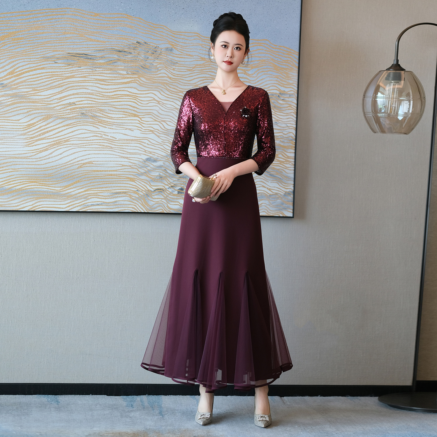 喜妈妈高贵气质连衣裙婚宴礼服秋季2025新款中老年高级感长裙礼服