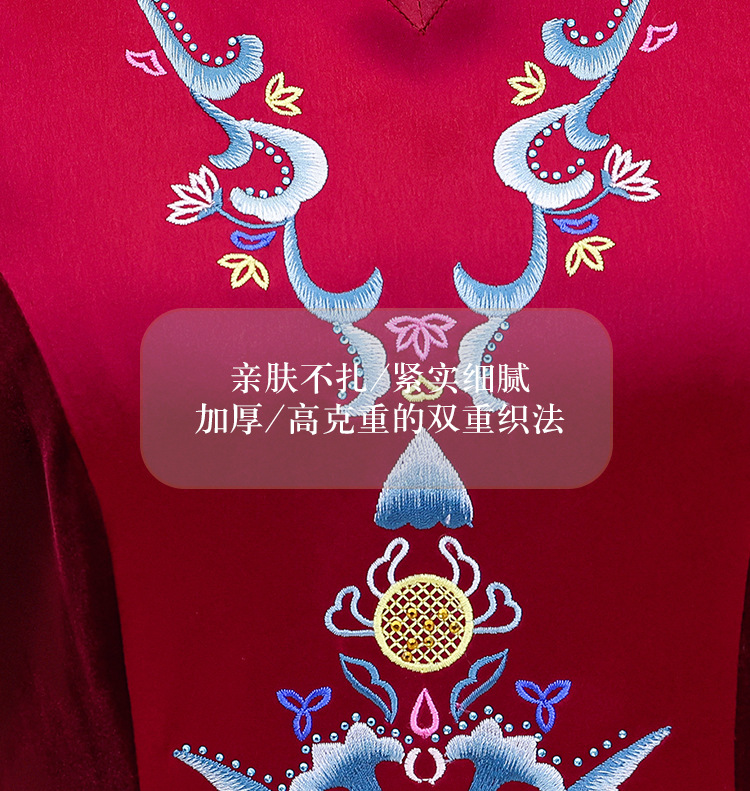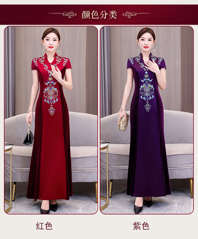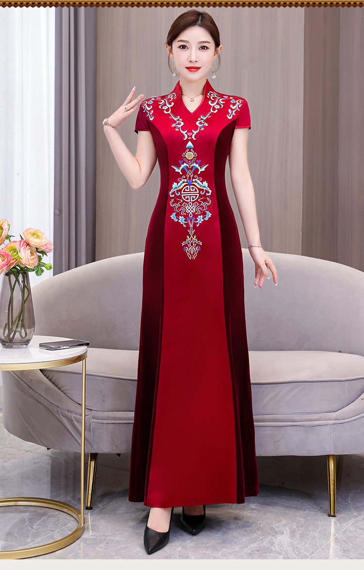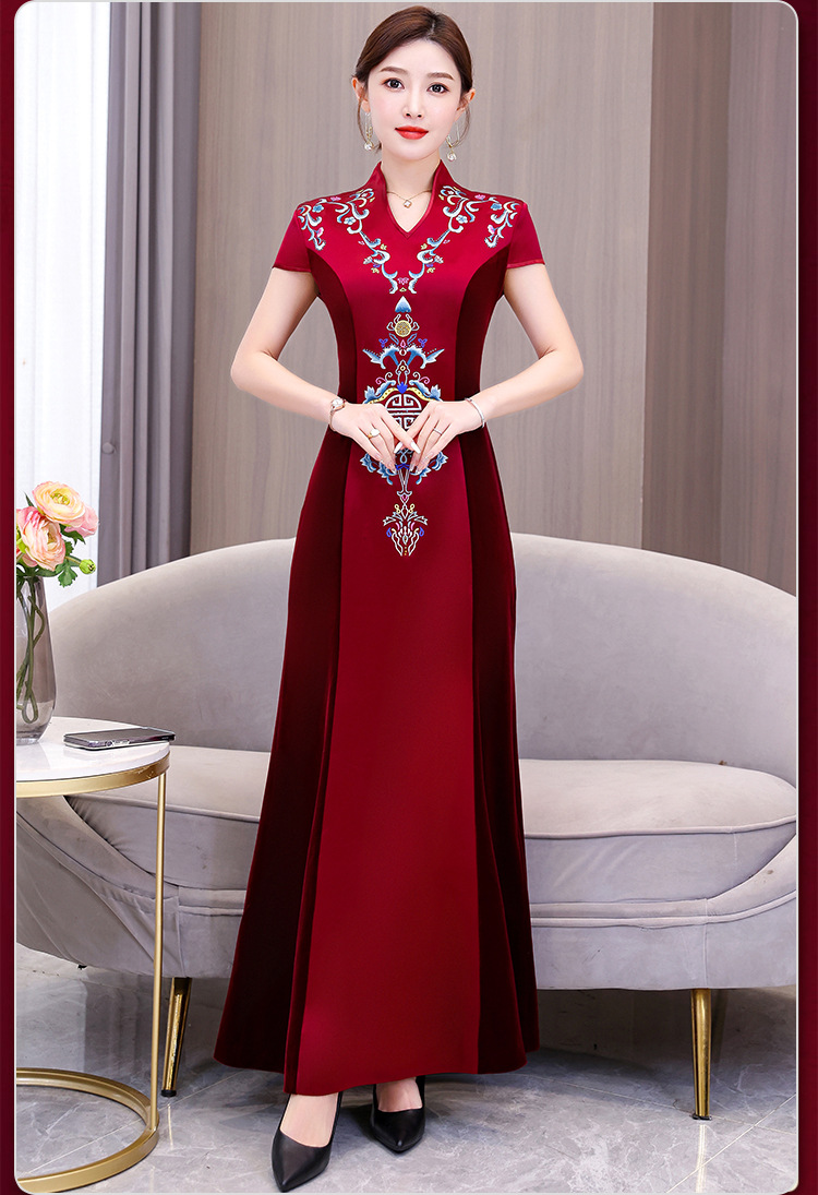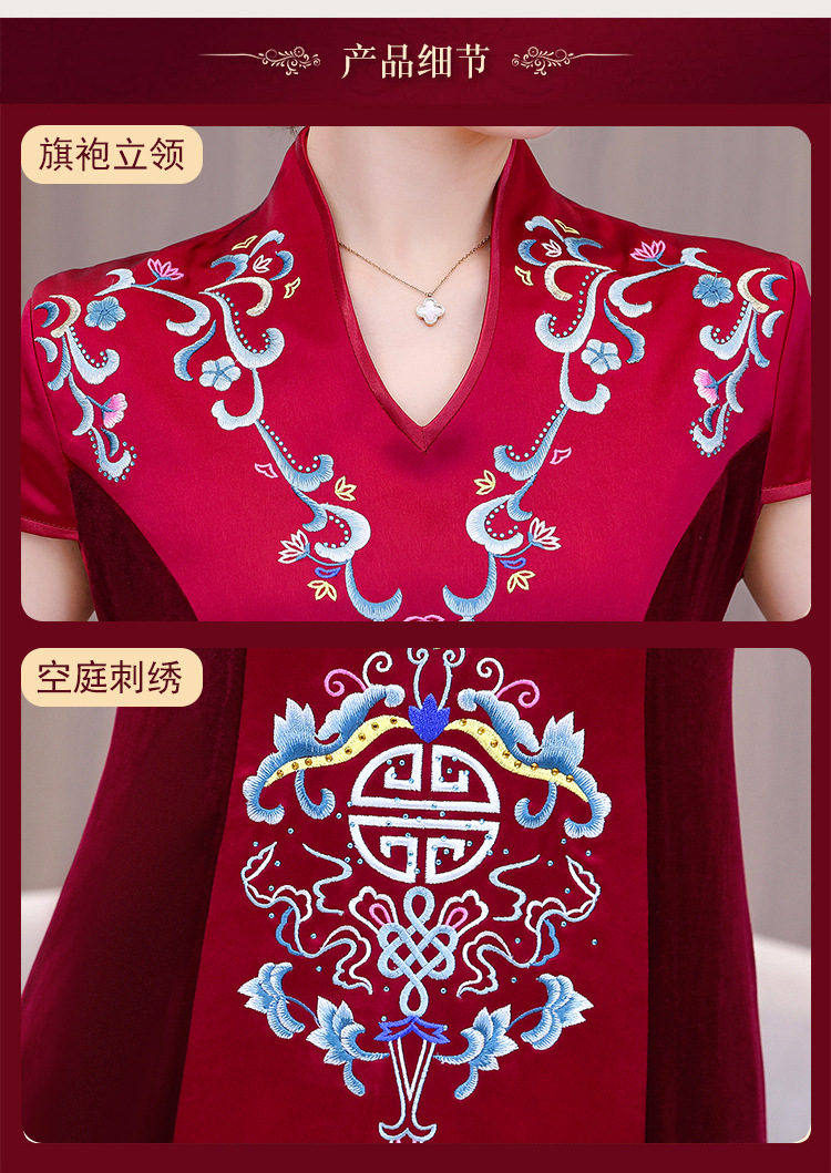 喜姑は大きい赤色の刺繍のチャイナドレスのドレスのスカートの2024春夏の新型のお母さんの服の気質の優雅なワンピースを詰めます。