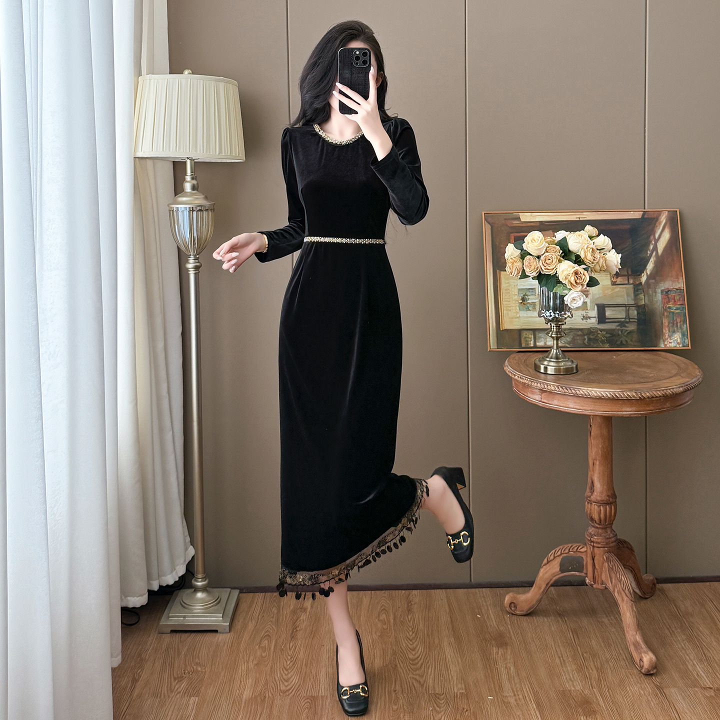 mnnz316丝绒流苏拼接重工钉珠连衣裙2025秋冬新款优雅显瘦小黑裙