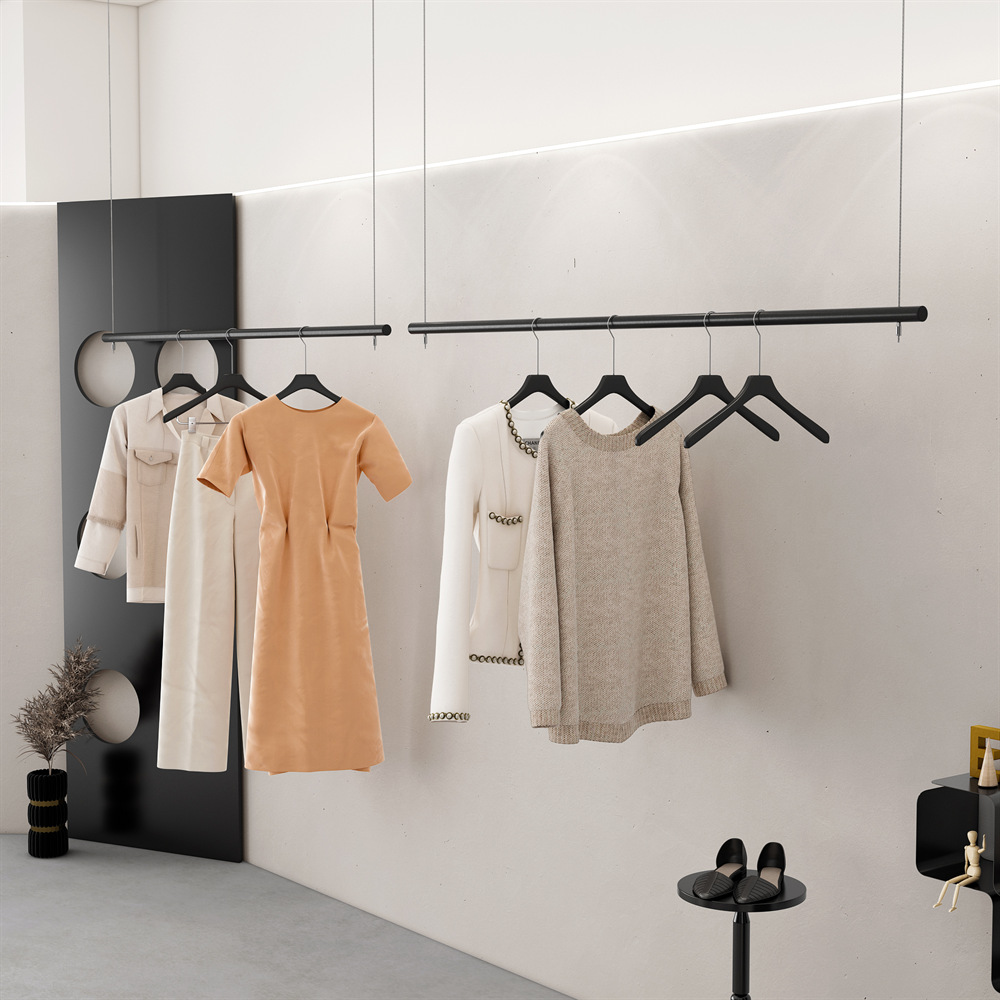 衣料品店ディスプレイラック ステンレス製吊り下げ天井棚 男女兼用子供服 黒色ディスプレイハンガー ウェディングドレスラック