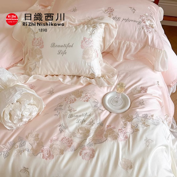 少女心純綿100本の双股長絨綿4点セットロマンチックな花卉刺繍布団カバー綿寝具