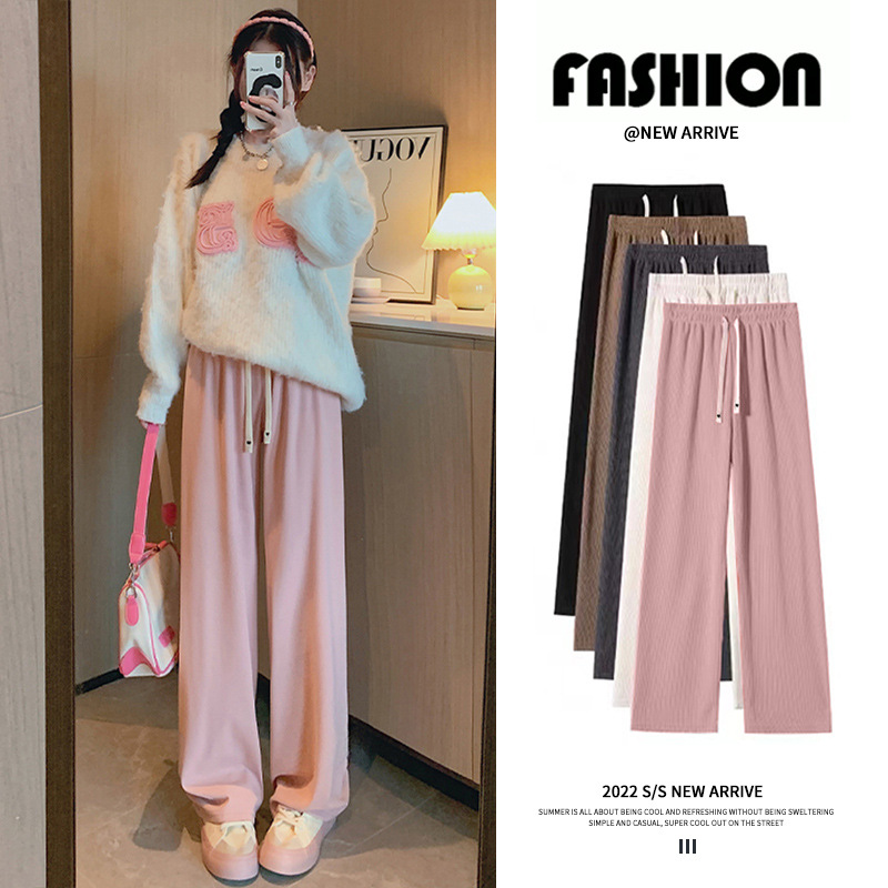春款舒适仿羊绒直筒阔腿遛弯裤女士港风松紧抽绳长裤休闲拖地裤子