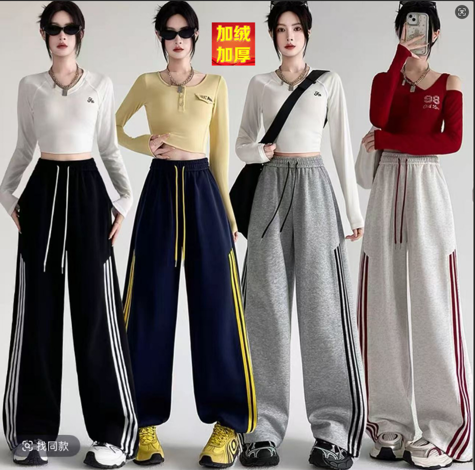 秋冬加绒美式辣妹斜纹三条杠可两穿阔腿卫裤女宽松休闲直筒长裤女