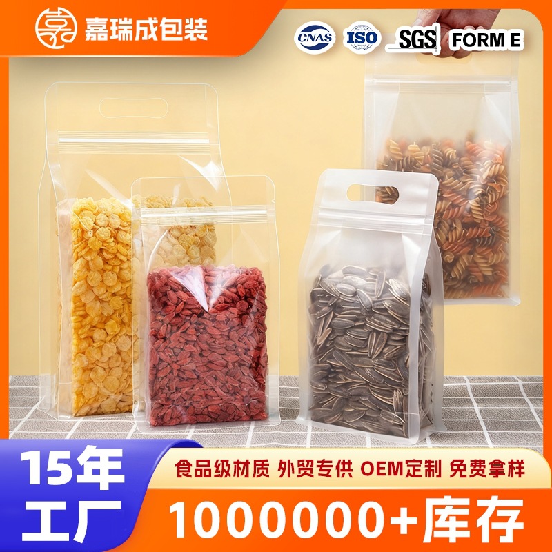 透明自立袋、つや消しジップロック袋、厚手食品包装袋、スナック・乾物包装、防湿PE密封袋