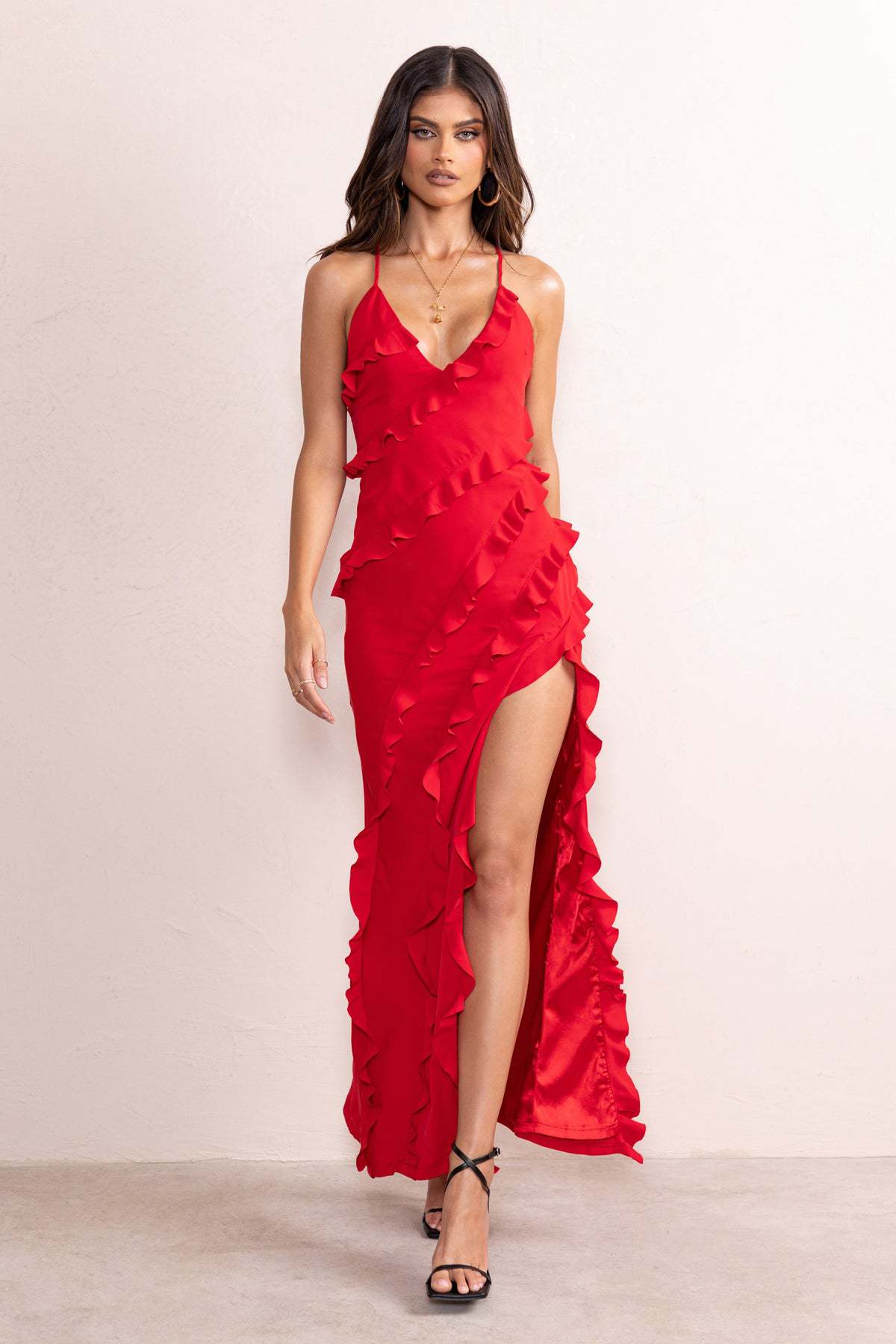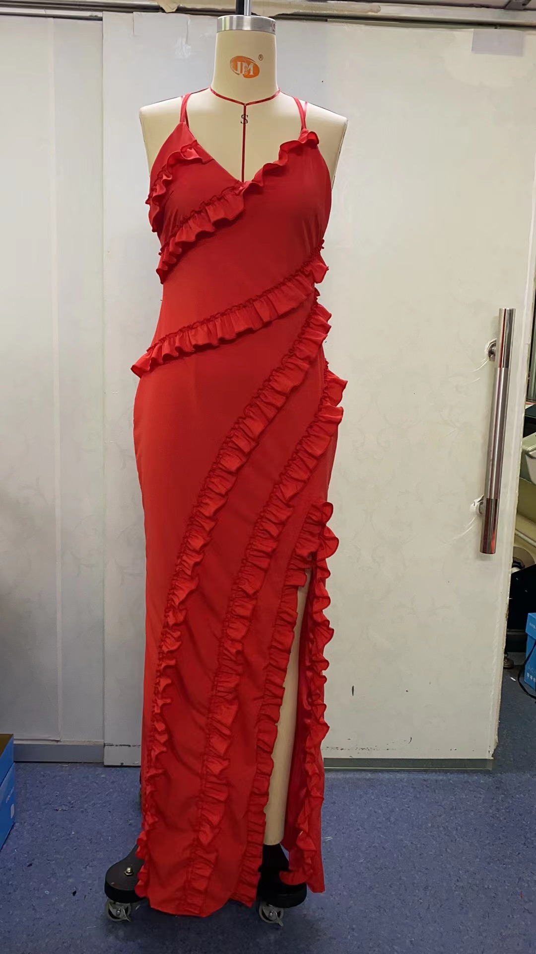 欧米の婦人服の春夏の越境の新型のハスの葉の縁のガーターのロングスカートのvネックのセクシーな露背の高い腰のフォークのワンピース
