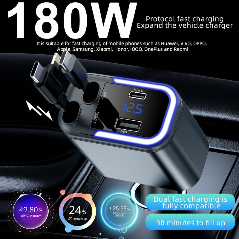 180W超级快充氛围灯车载充电器一拖五自带伸缩线汽车点烟器转换器