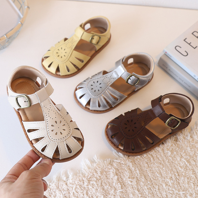 国境を越えた真皮韓国児童サンダル夏ロリータ軟底赤ちゃん靴透かし彫り通気性少女ビーチサンダル