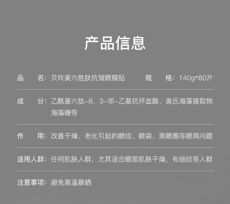 製品仕様 六勝ペプチド抗しわアイマスク140g * 80錠