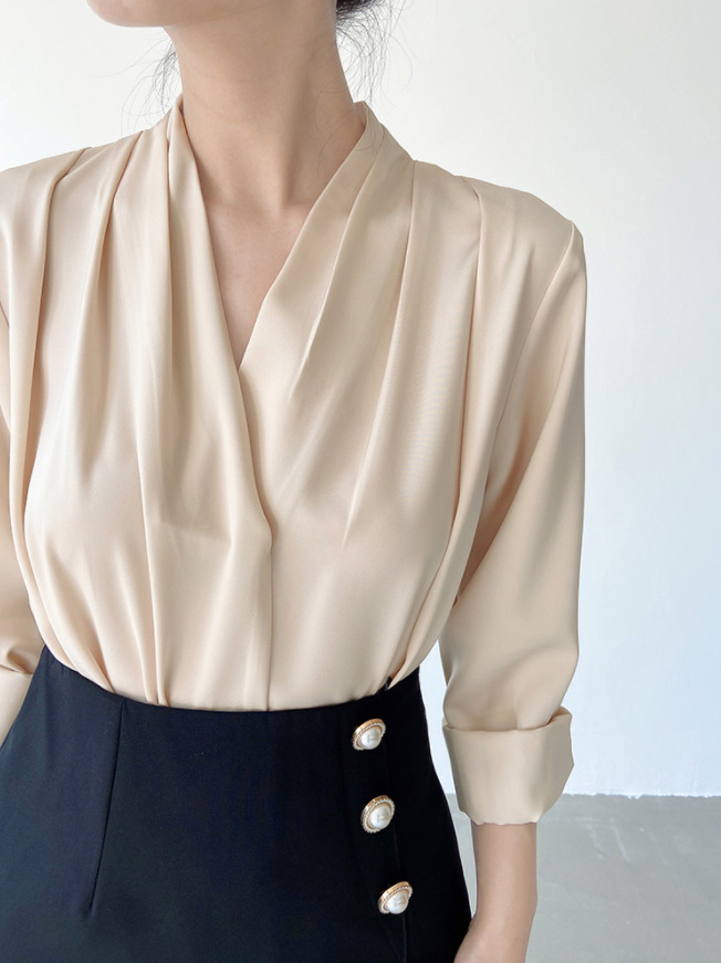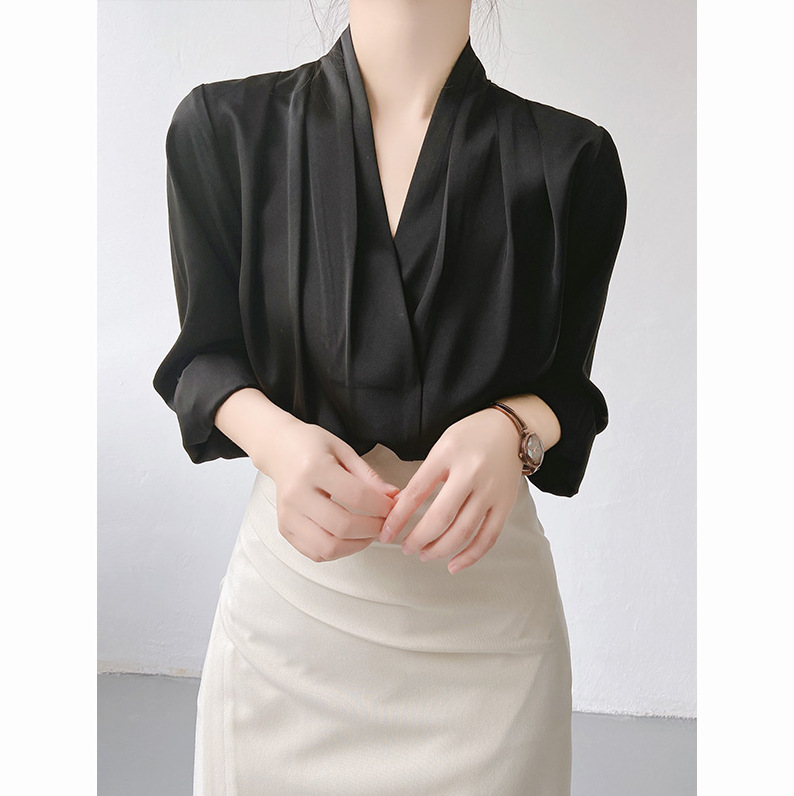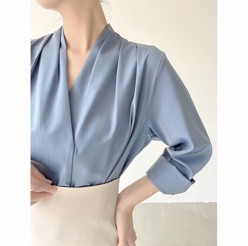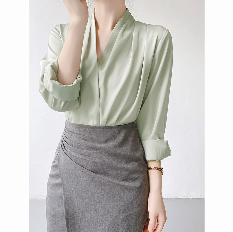 軽くて熟した大気の高級感のあるサテンのシャツの女性の夏のvネックのデザイン感の小さい大衆のシャツの職業の上着