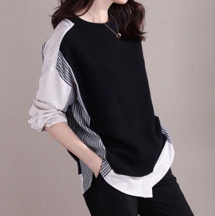 ヨーロッパラウンドネックスウェットシャツ秋と冬のニットスプライシングルーズレイジースタイルプルオーバー多用途カジュアル気質長袖トップ女性用