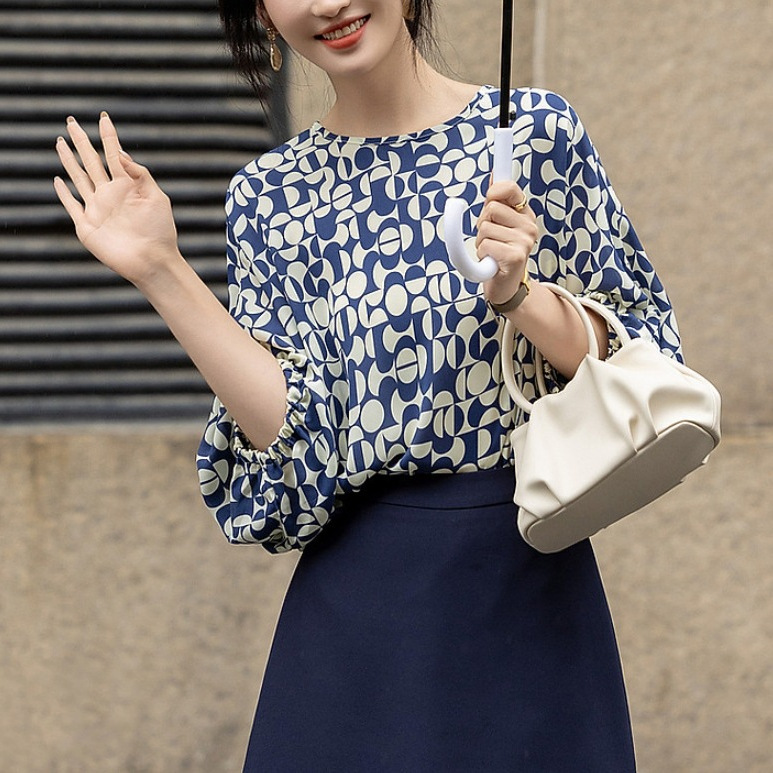 ヨーロッパの白いプリントサテンシャツ女性の高級感があります。
