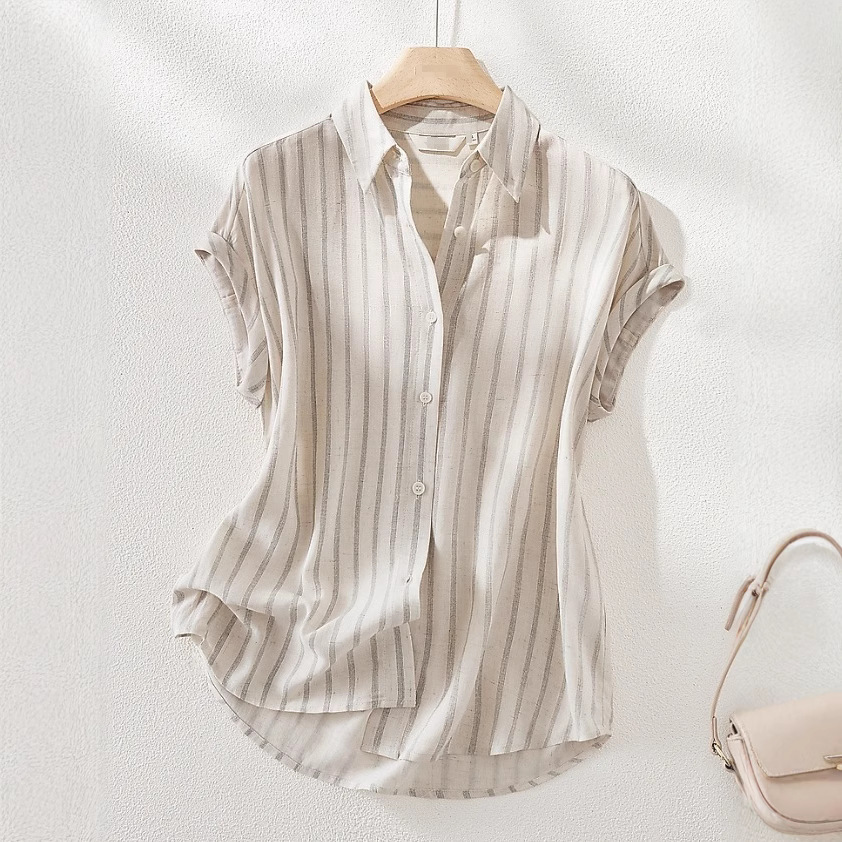 古いお金の風は亜麻のストライプのファッションのシャツの女性の2025夏の新型の気質の通勤のカジュアルな顕やせている上着の潮に似せます。