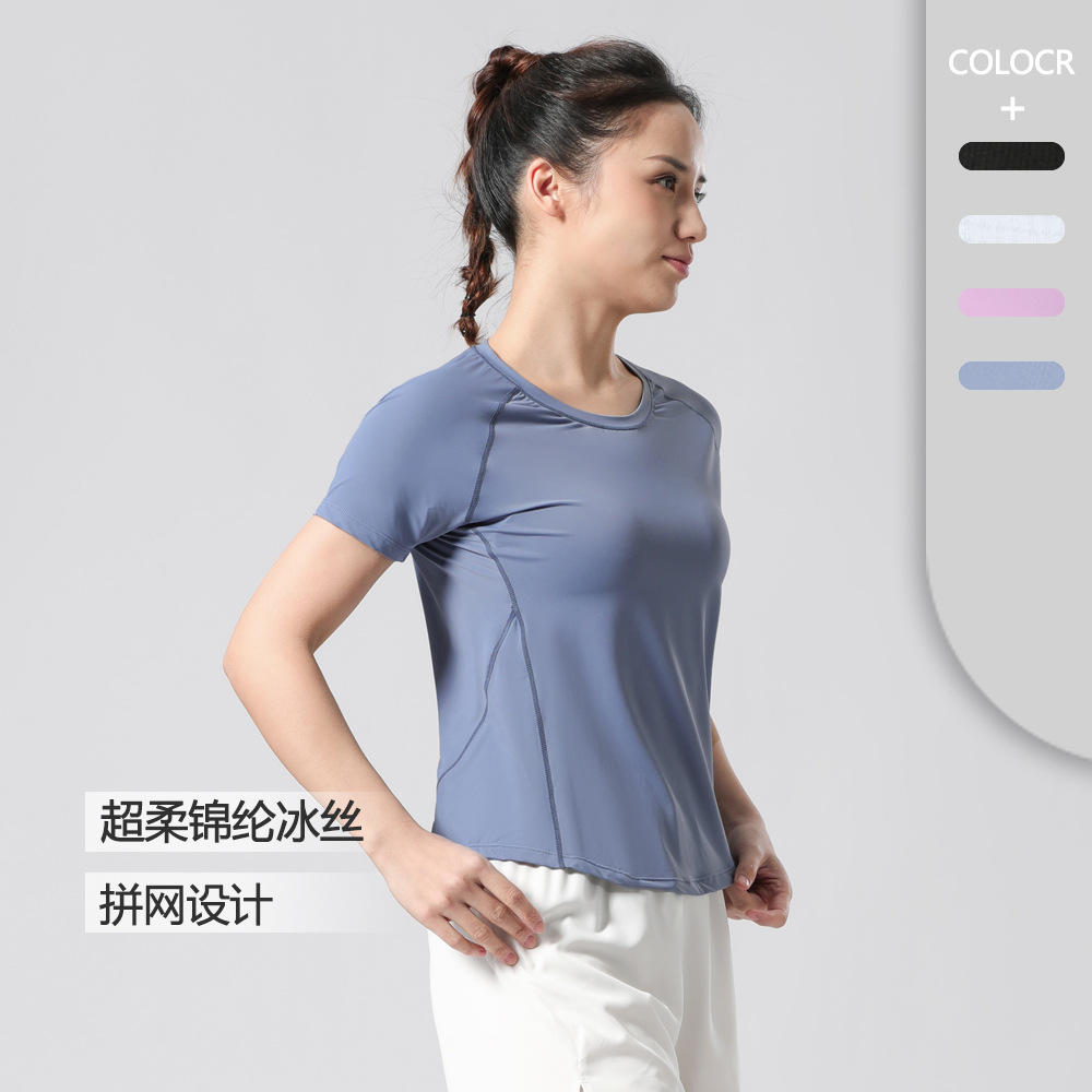 夏用ナイロンアイスシルク高弾性スリムフィットランニング速乾性フィットネススポーツ半袖吸汗通気性ラウンドネックTシャツ(女性用)