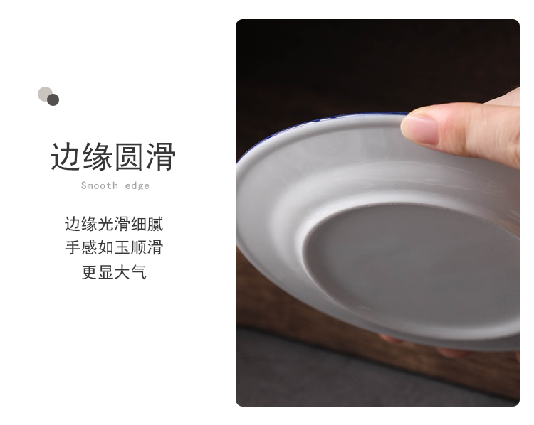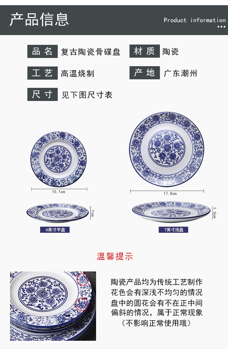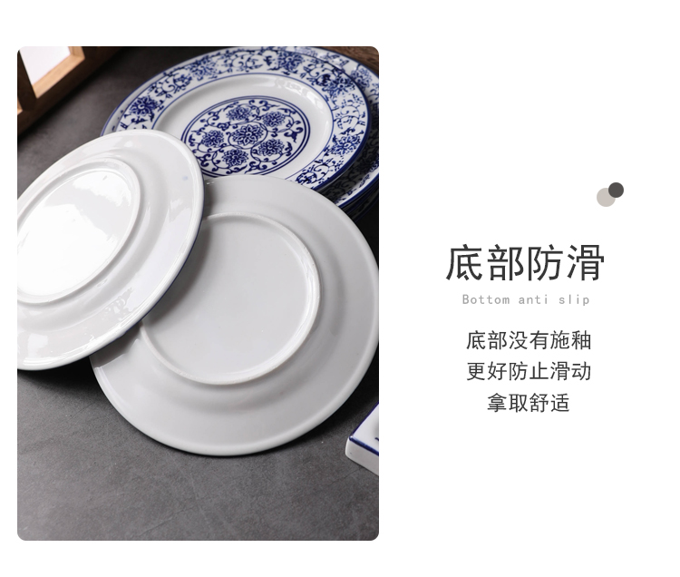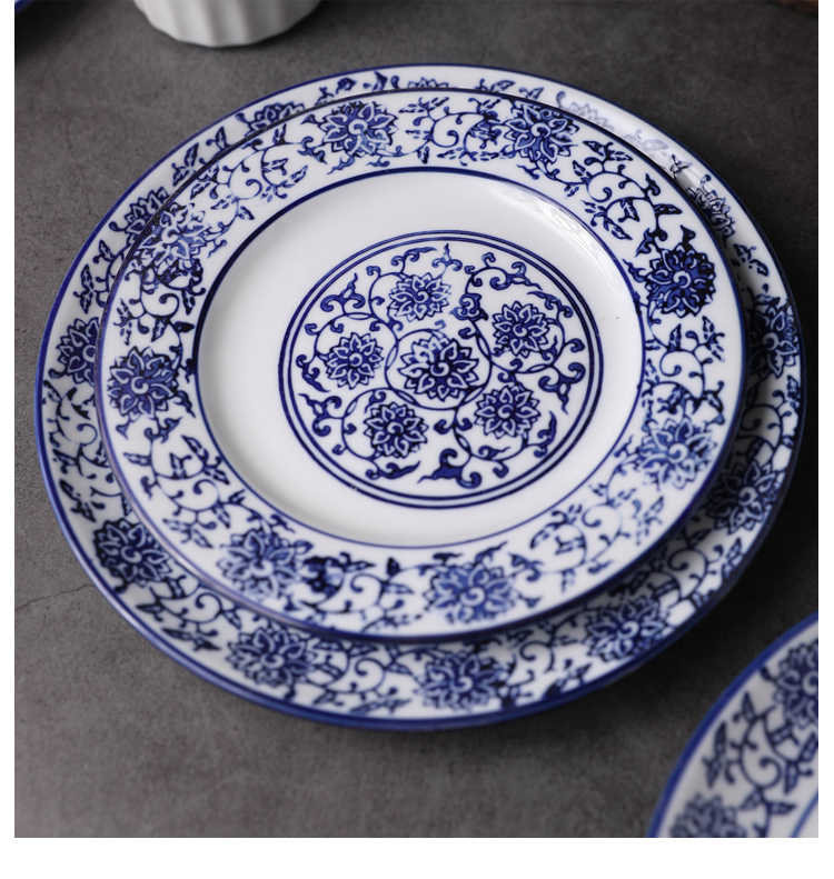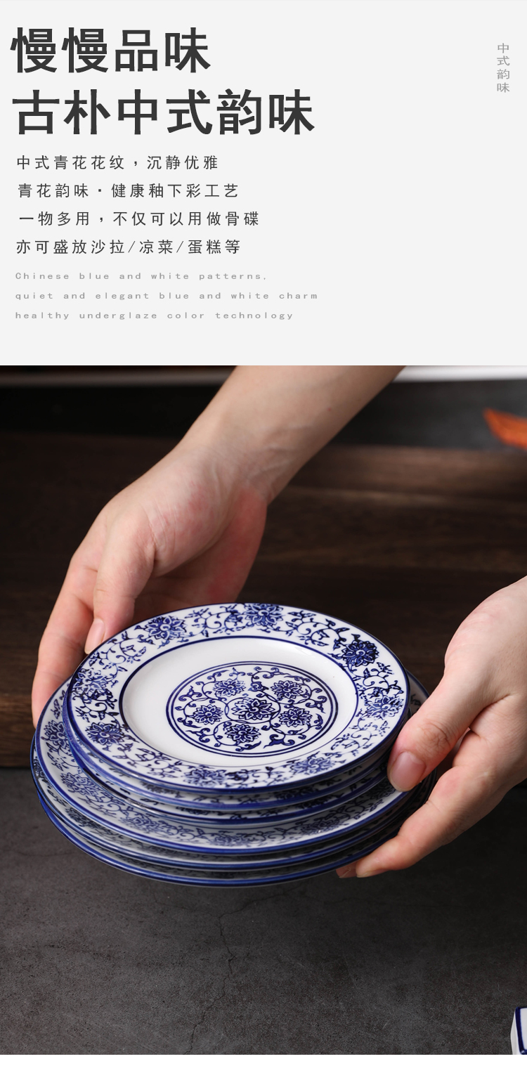 卸売り青花皿中国式復古丸型7インチ骨皿家庭用レストラン平盤浅盤釉薬下彩セラミックス
