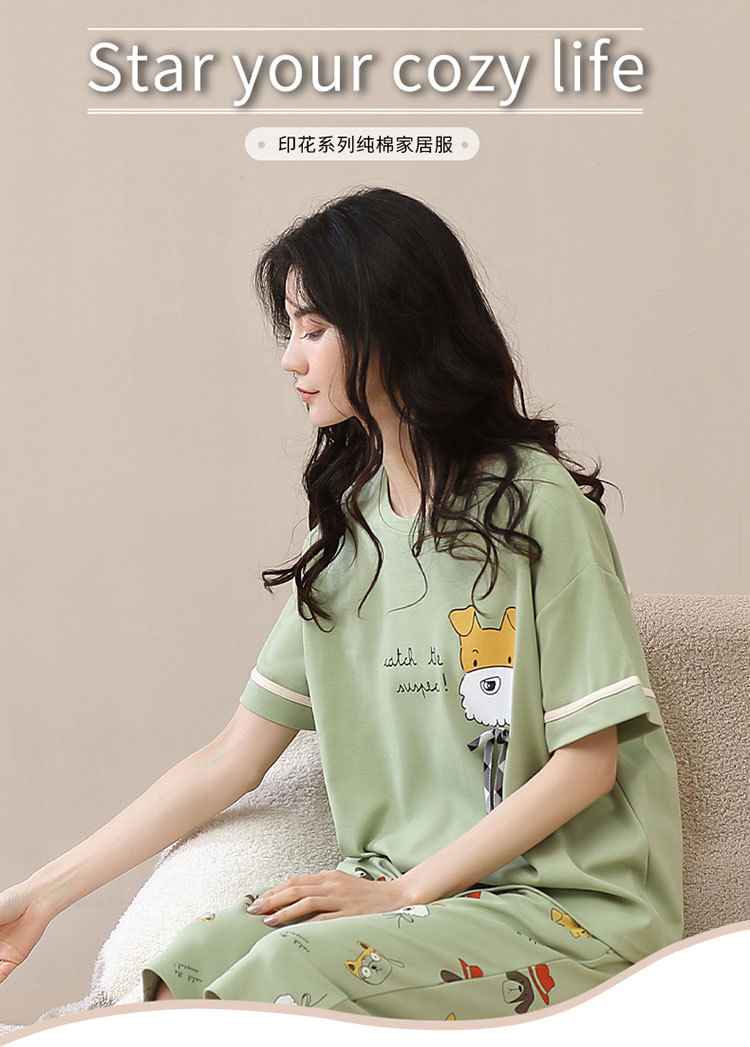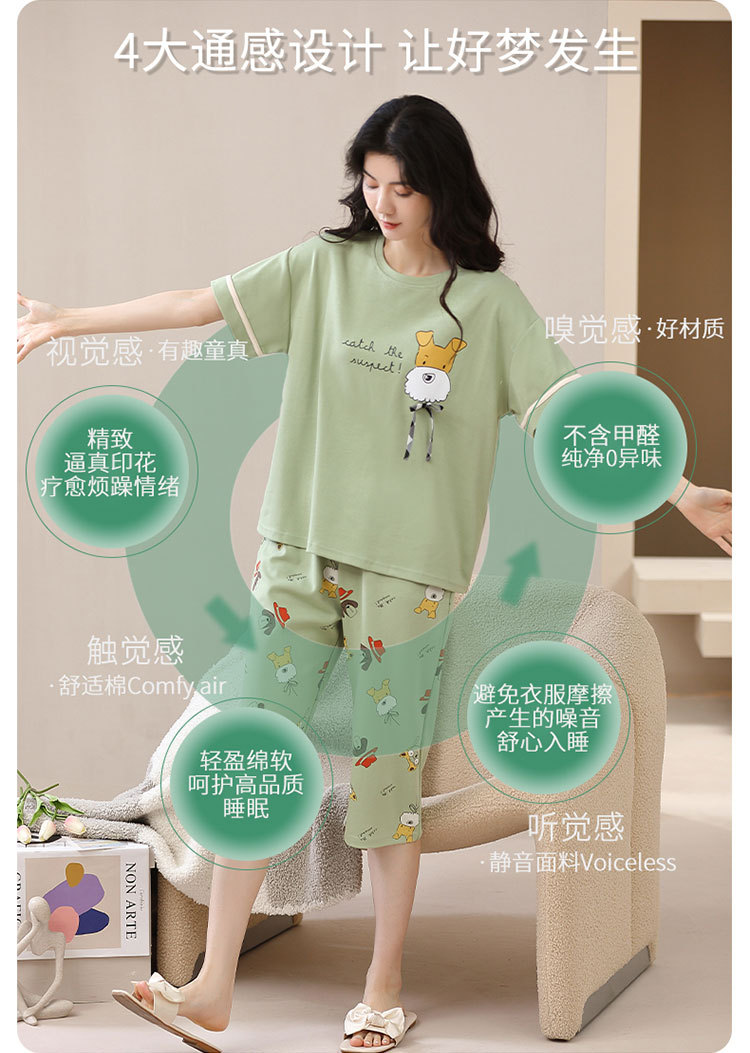 純綿の女性の新しいパジャマの丸首の韓国版のかわいい綿の7分のズボンの小さい香風の家庭服の女性の薄いタイプの春の服