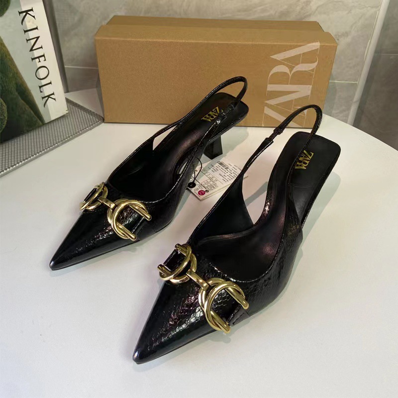 ZA新型2024夏の先端の一字は浅い口の細いハイヒールの女性の金属の装飾のボタンの後で空のサンダルの女性の潮を持ちます。