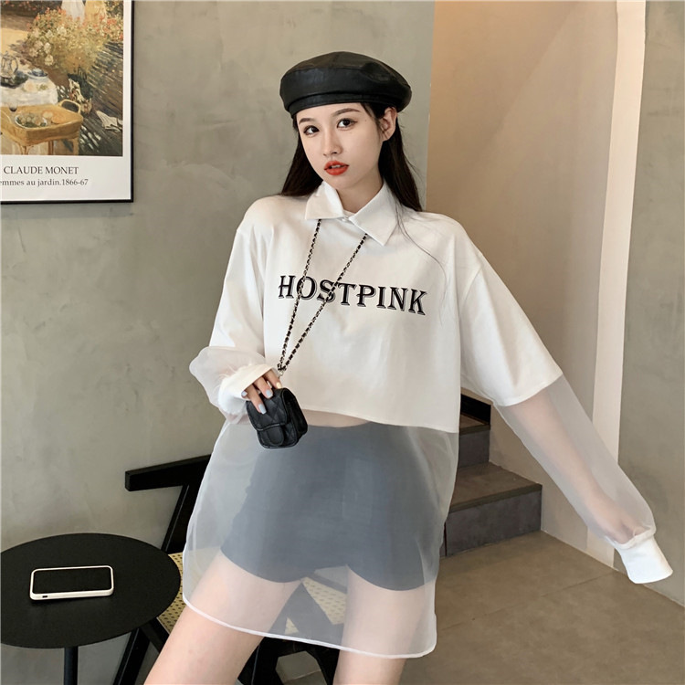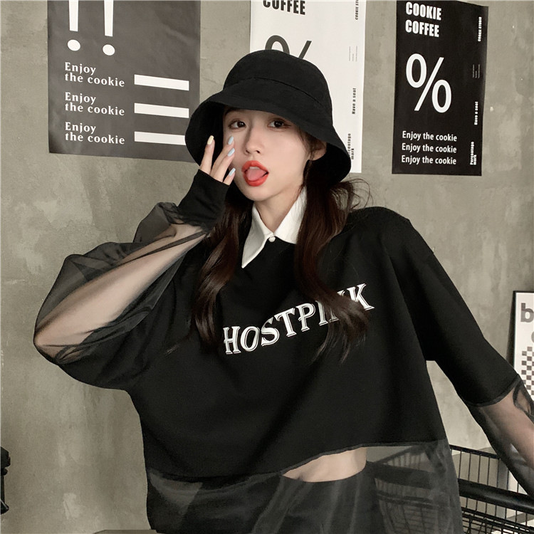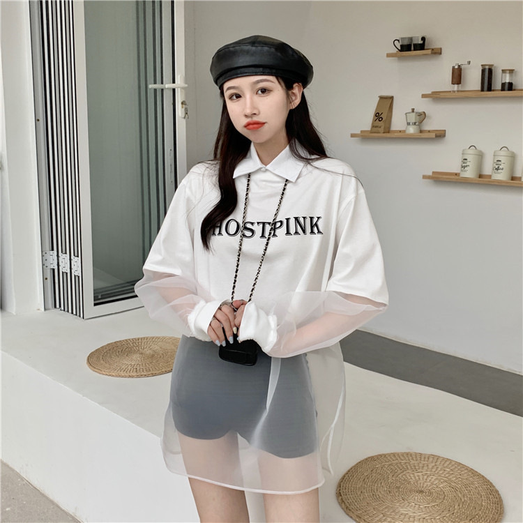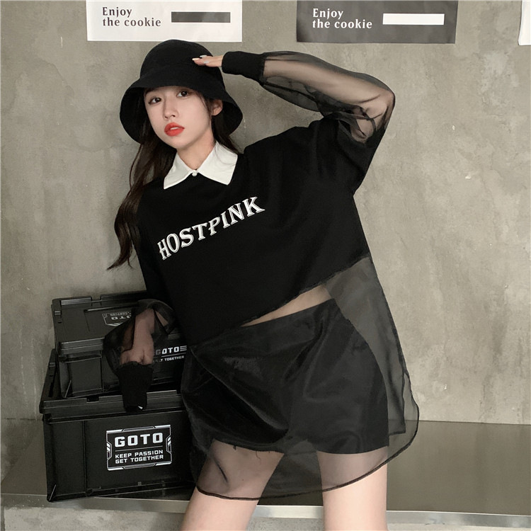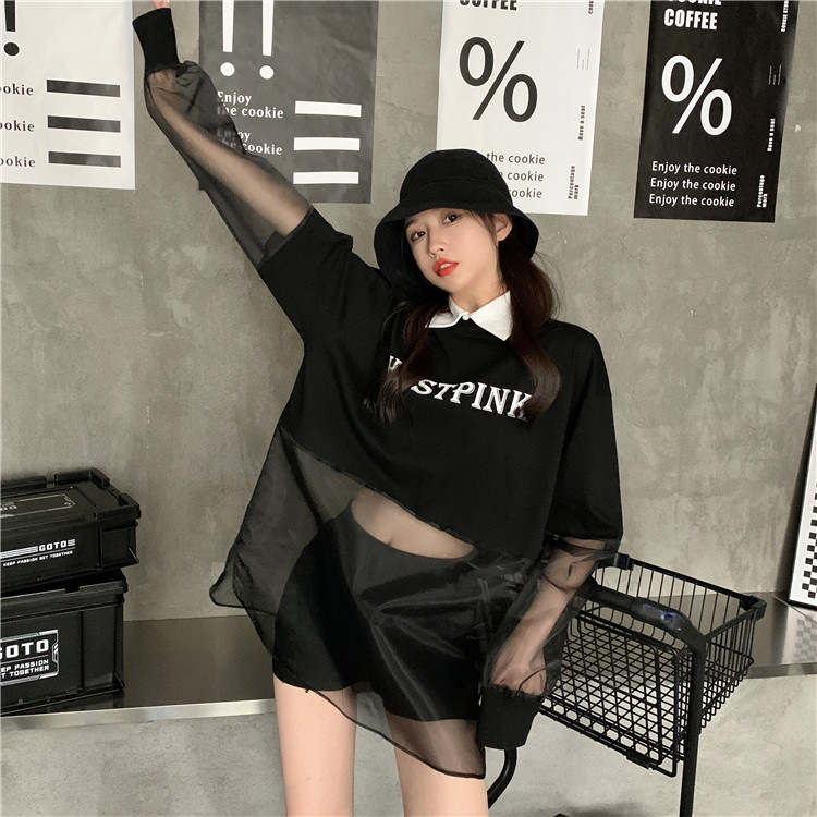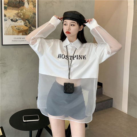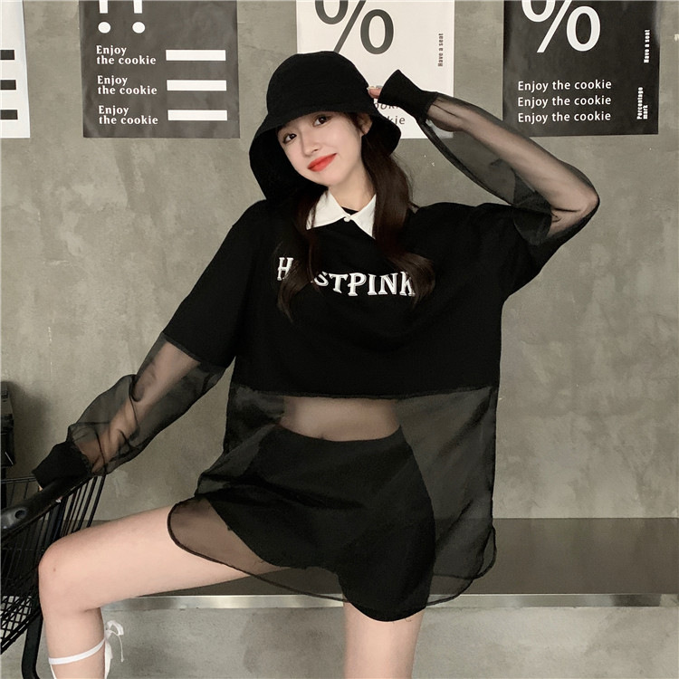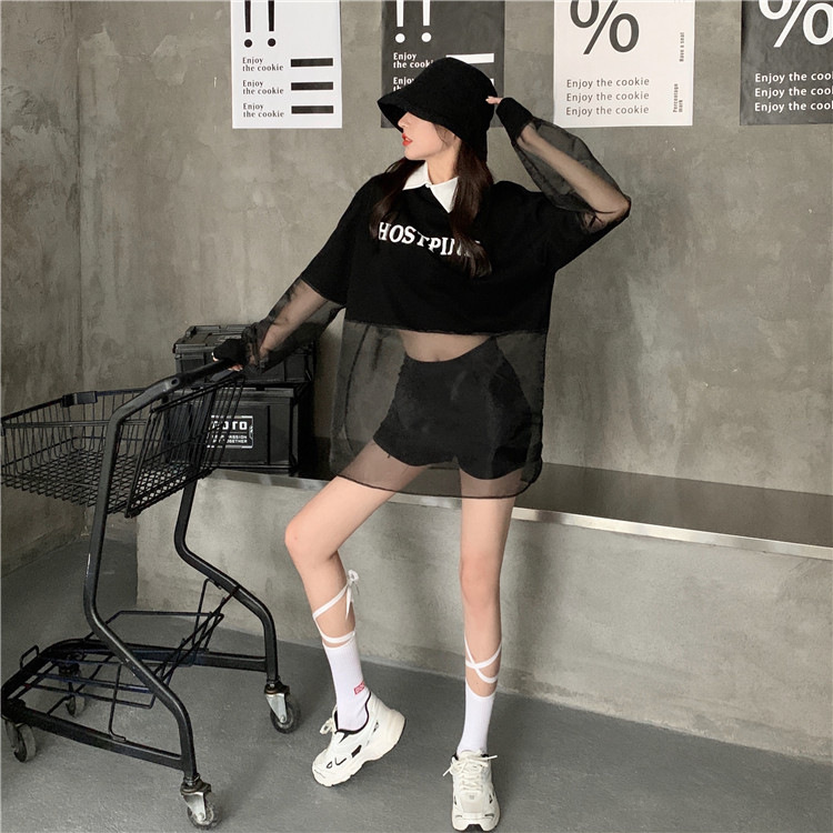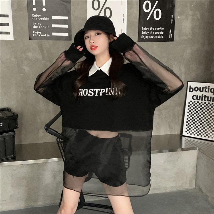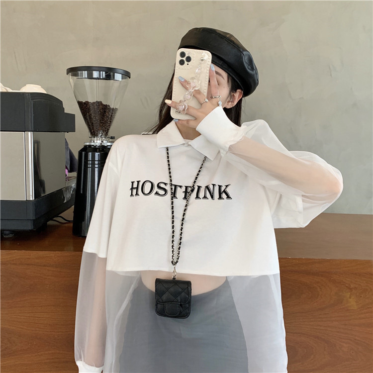 ネットセレブ愛用のレディースファッション、2025年夏新作、透け感のあるメッシュ素材のポロ襟Tシャツ、長袖セクシーなホットガールトップス