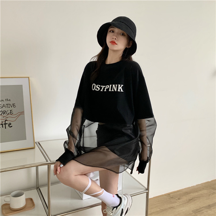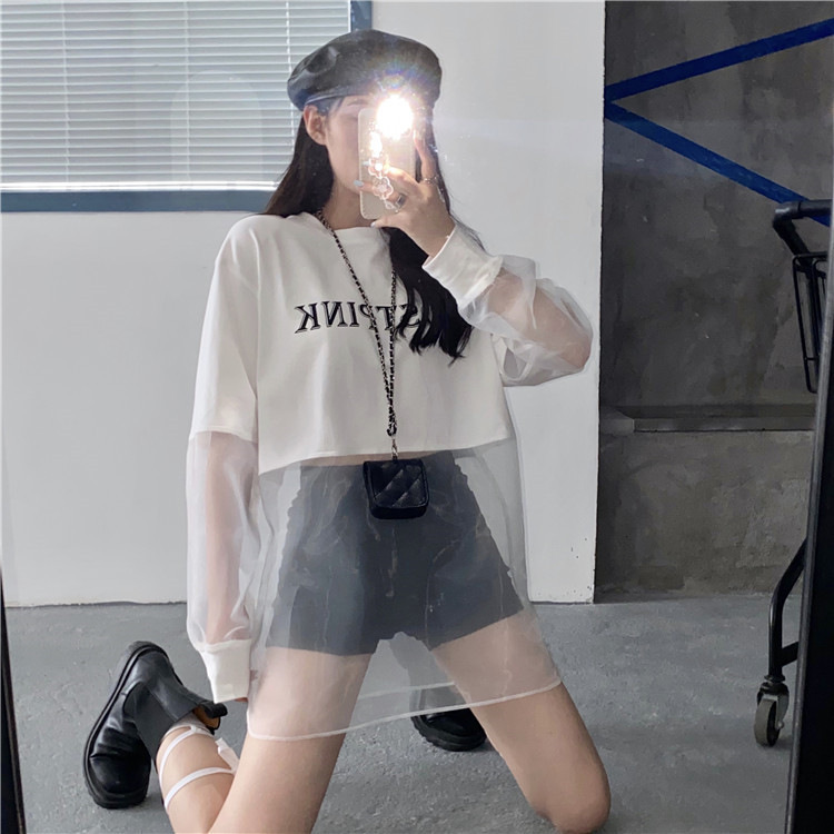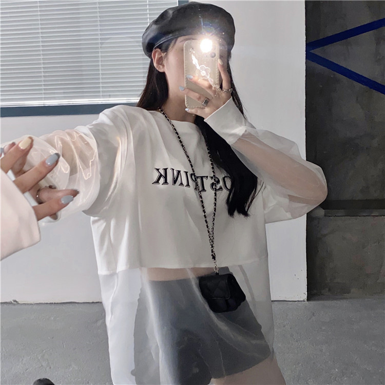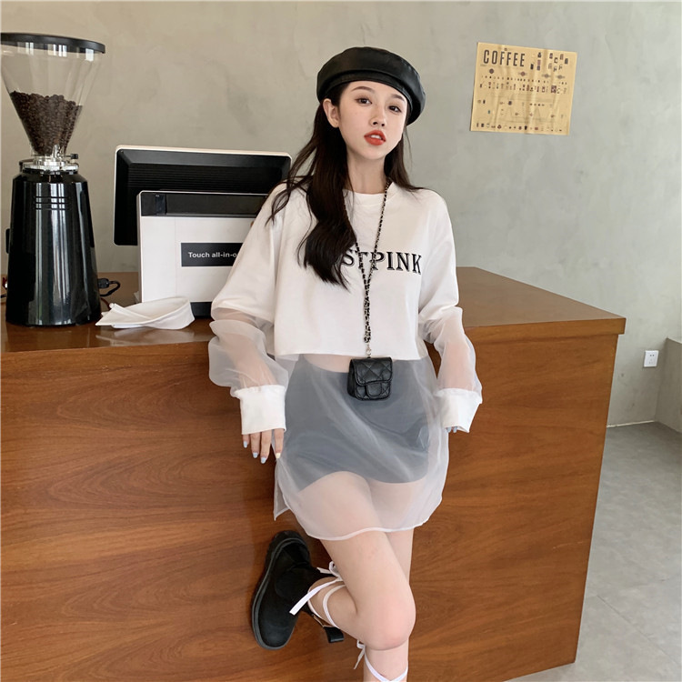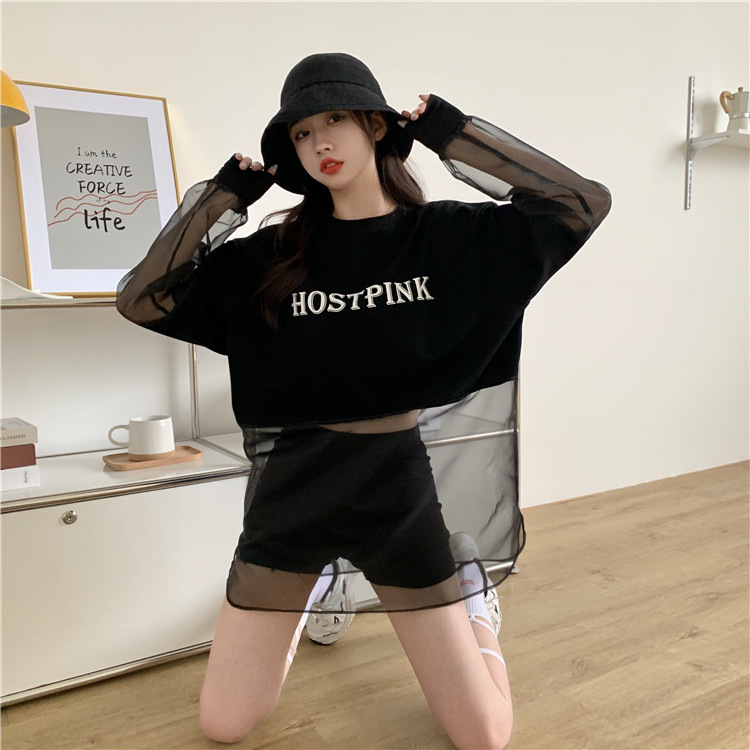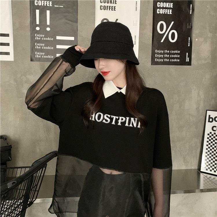 新しいクロスボーダーフェイクツーピース長袖スウェットシャツ女性のためのルーズ韓国スタイル薄いセクション2025夏ラウンドネックレタースウェットシャツ女性のための