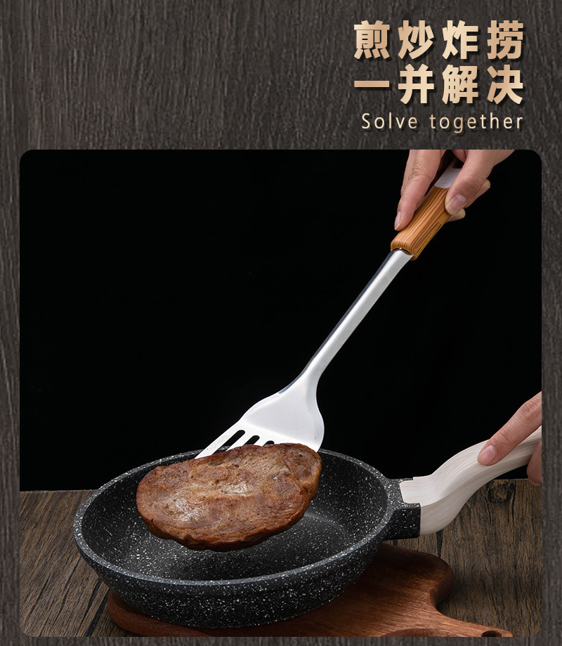 ステンレスのパーマ防止の取っ手の鍋のシャベルのスプーンの漏れのスプーンは木目の調理器具のセットの台所の家庭用の炒め物のシャベルの厚いです。