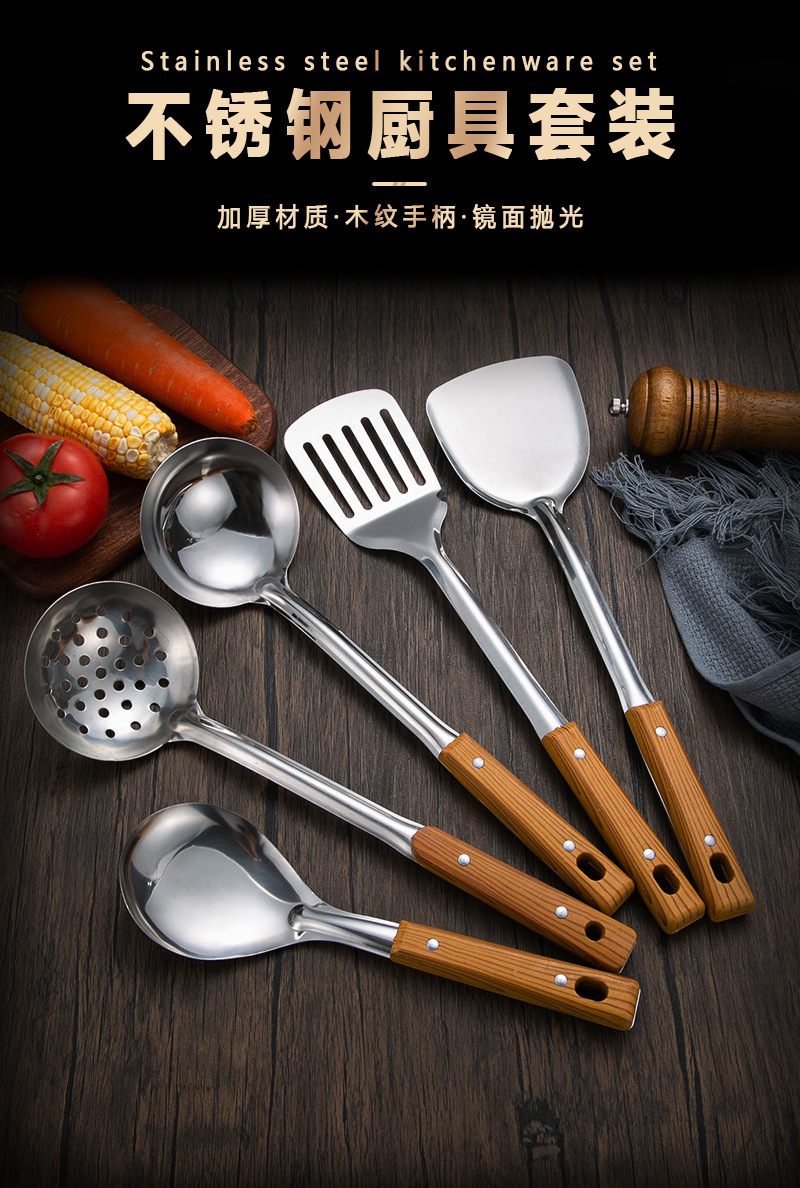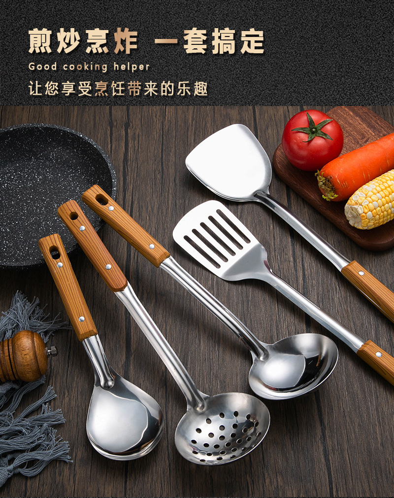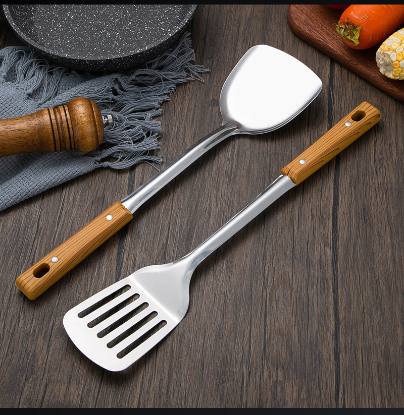 ステンレスの木の柄の鍋のシャベルの調理器具のセットの家庭用の鍋のシャベルのスプーンのフライパンのスプーンの現物の卸売り