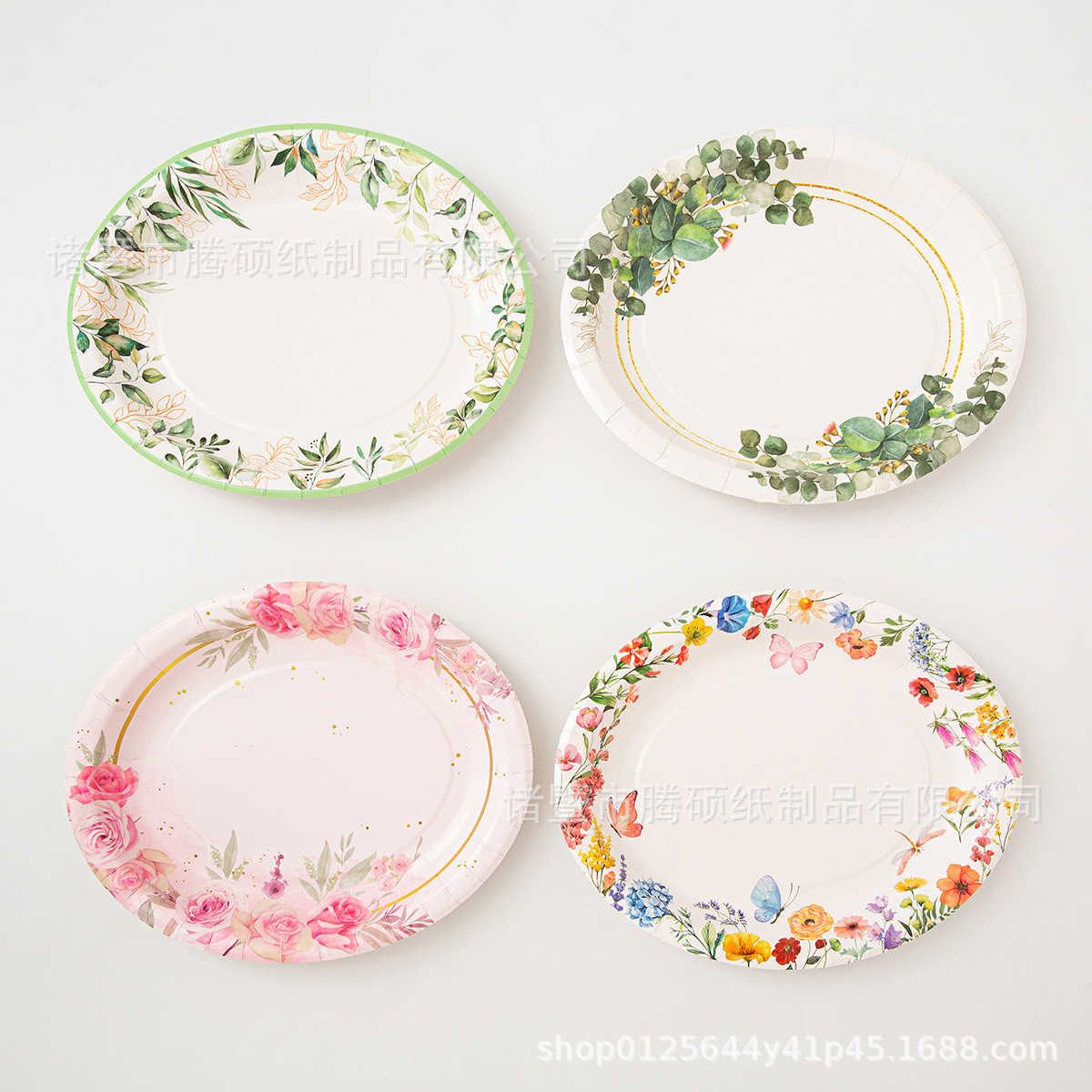 人気アマゾン春草花シリーズ使い捨て楕円皿皿分解可能食器バーベキューパーティー紙皿