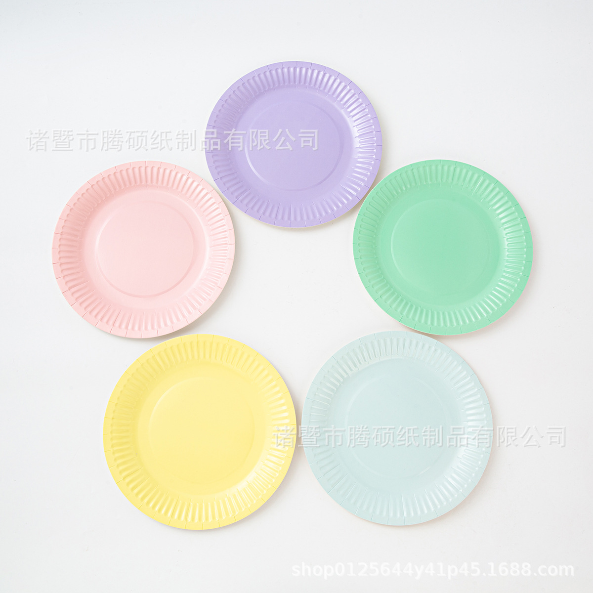 国境を越えた新しい誕生日パーティー使い捨て紙皿紙皿ボウルマカロンカラーラウンドプレートホリデーパーティーケーキプレート