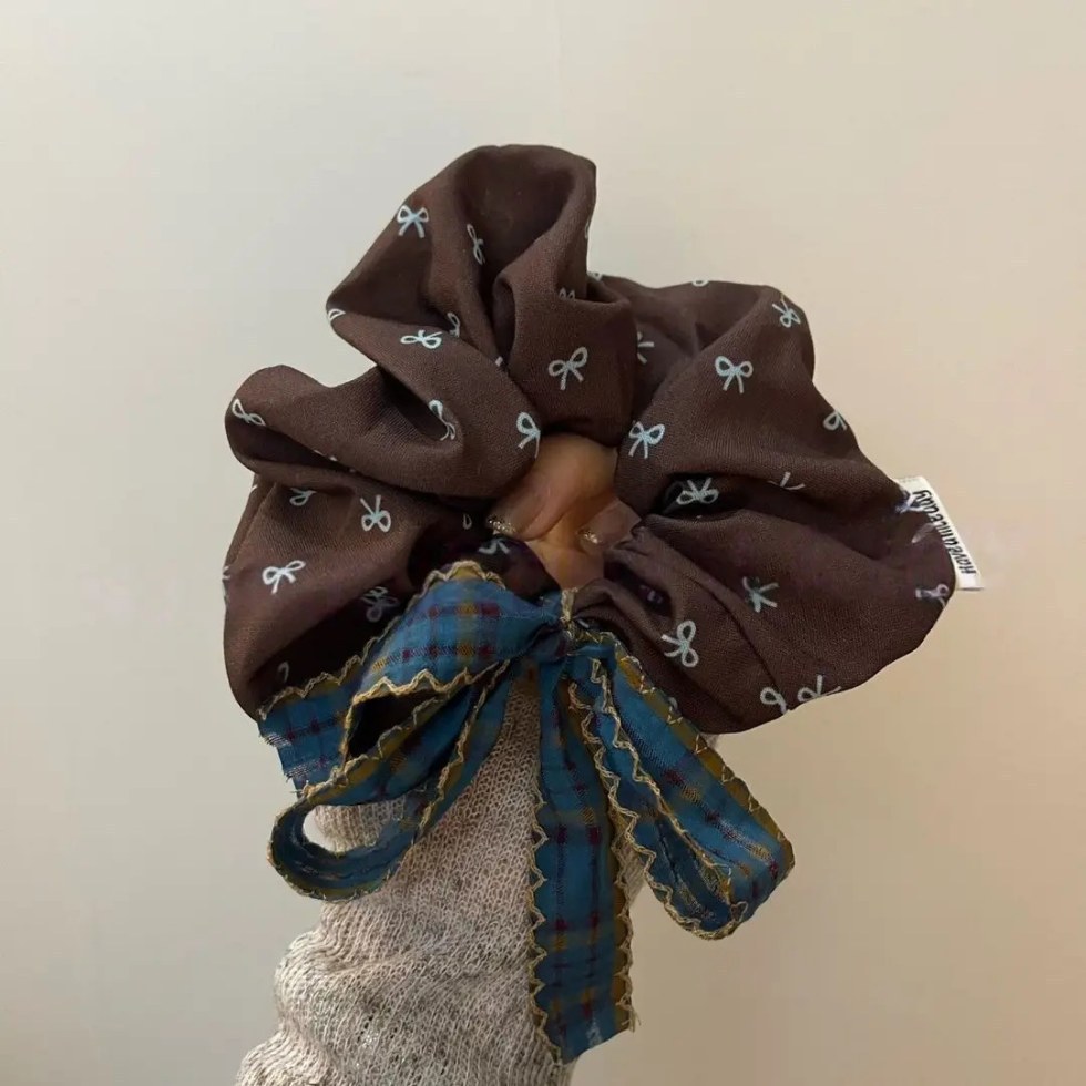 法式碎花咖色原创布艺飘带发饰蓝绿格纹蝴蝶结森系头发圈高级丸子