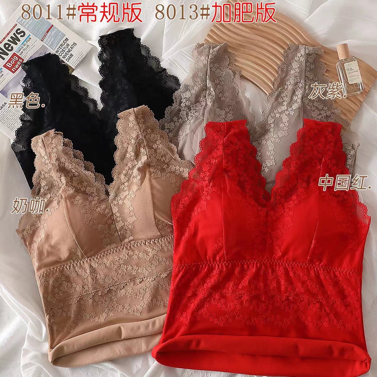 秋冬に起爆したベルベットレースvネックストラップベスト女性の発熱下着は、ブラジャーの大きいサイズの美背を着用しないでください