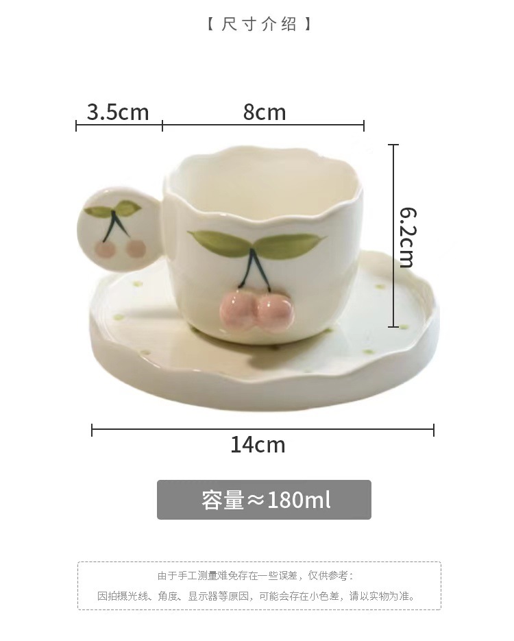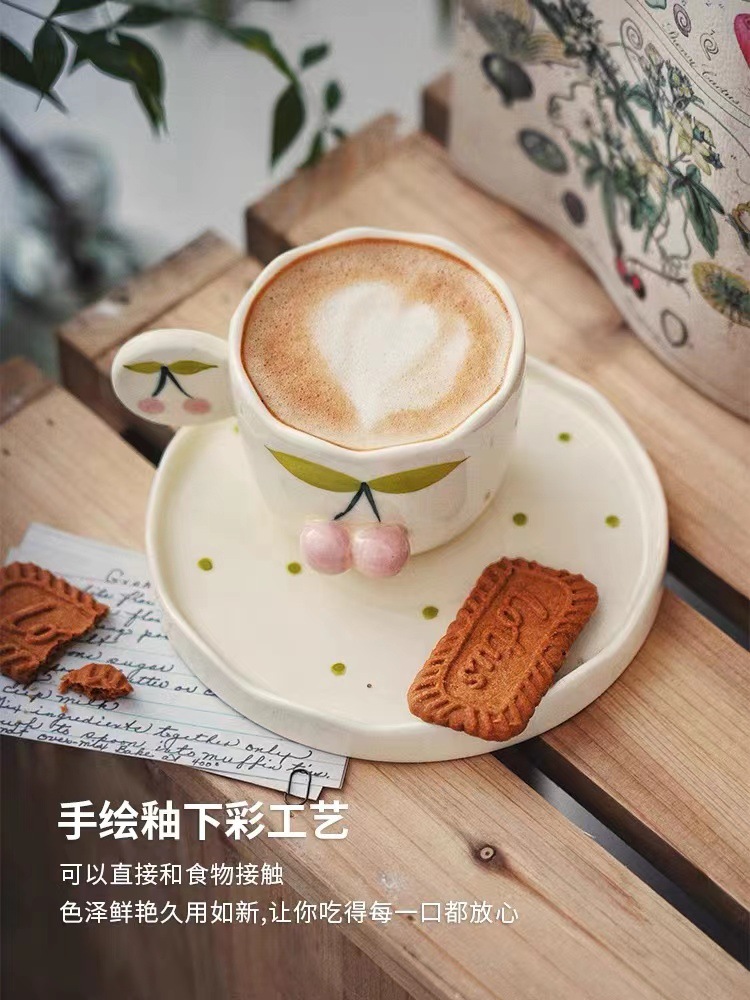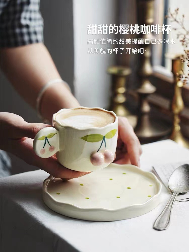 手描きレリーフさくらんぼ陶磁器カップ皿高颜値コーヒーカップセットトレイ付きミルクfufu昼寝カップ