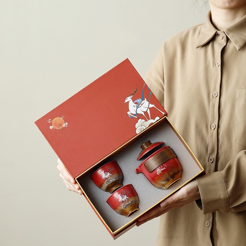 故宮紅鹿要素陶磁器工夫茶器一壺二杯ティーポットセットビジネスお土産カスタムロゴ