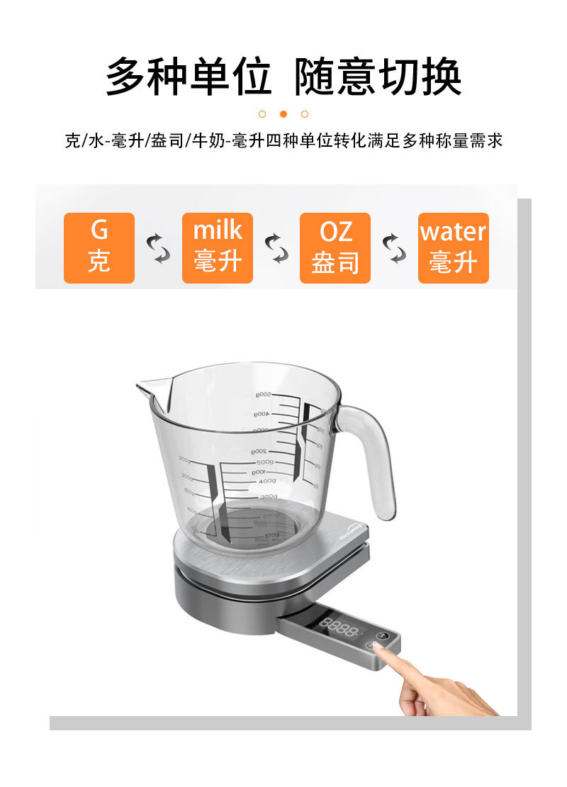 機能 2.単位変換機能:g(グラム)、oz(オンス)、water-ml(水-ml)、milk-ml(ミルク-ml)