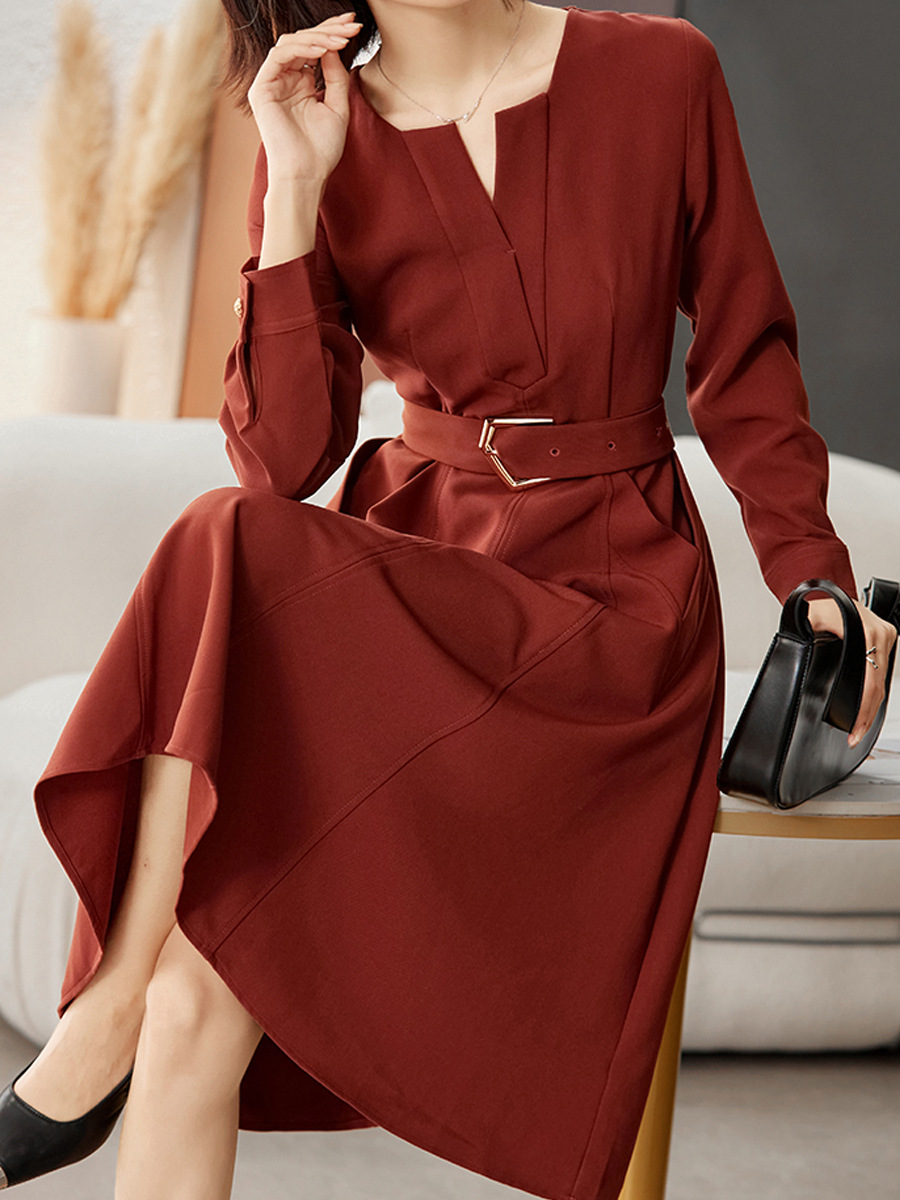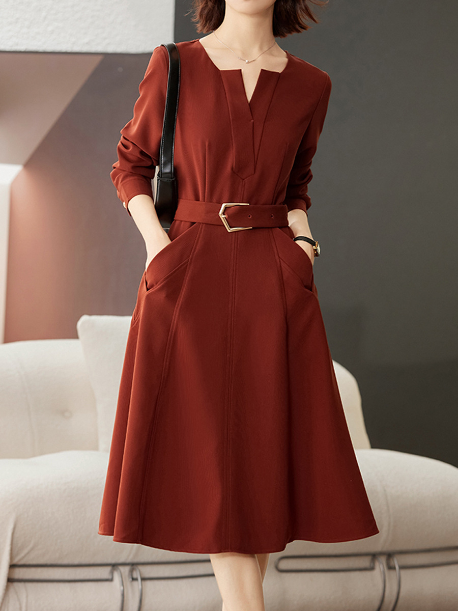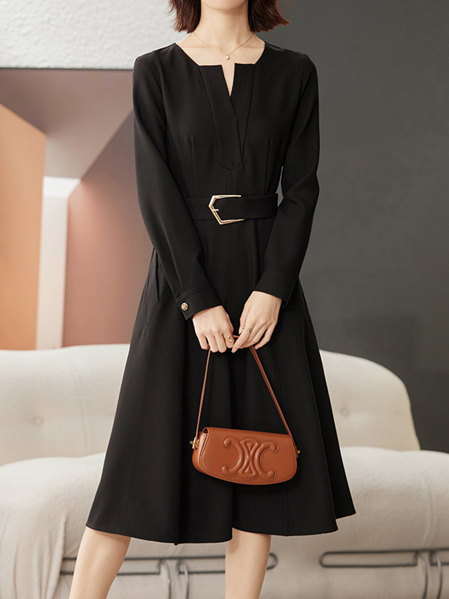 気質のある通勤用長袖アウタースカート、2025年秋新作女性用Vネックウエスト痩身シャツドレス