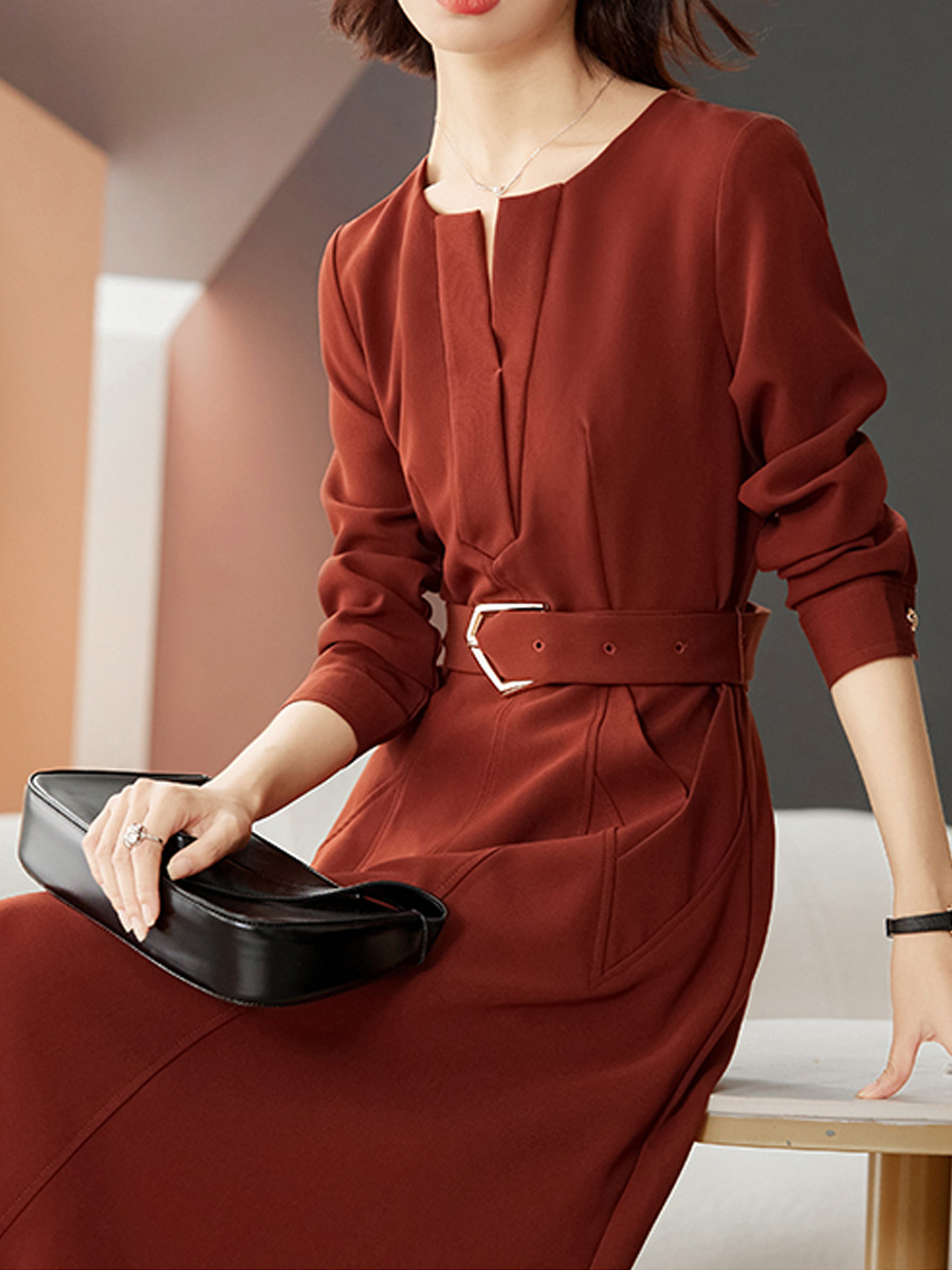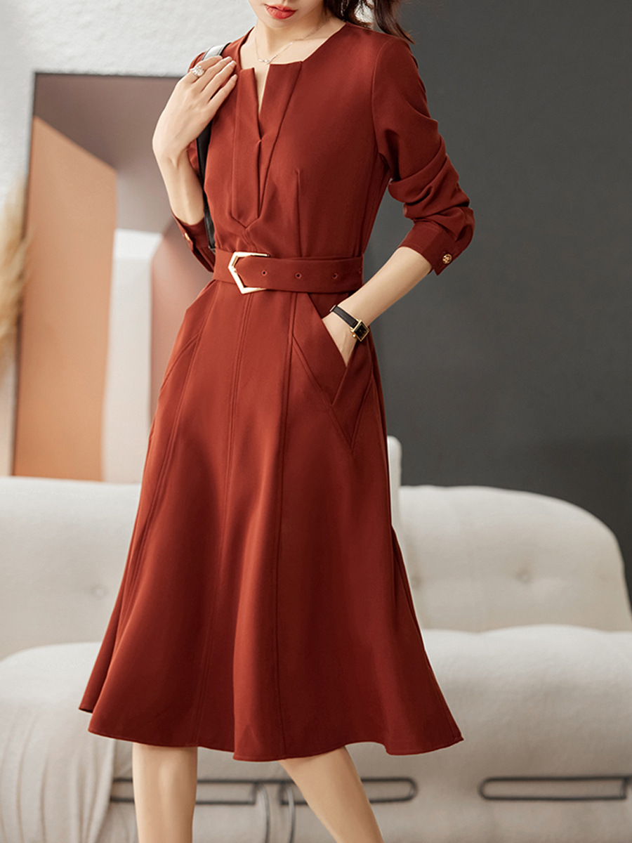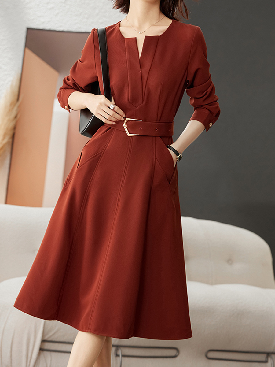 気質のある通勤用長袖アウタースカート、2025年秋新作女性用Vネックウエスト痩身シャツドレス