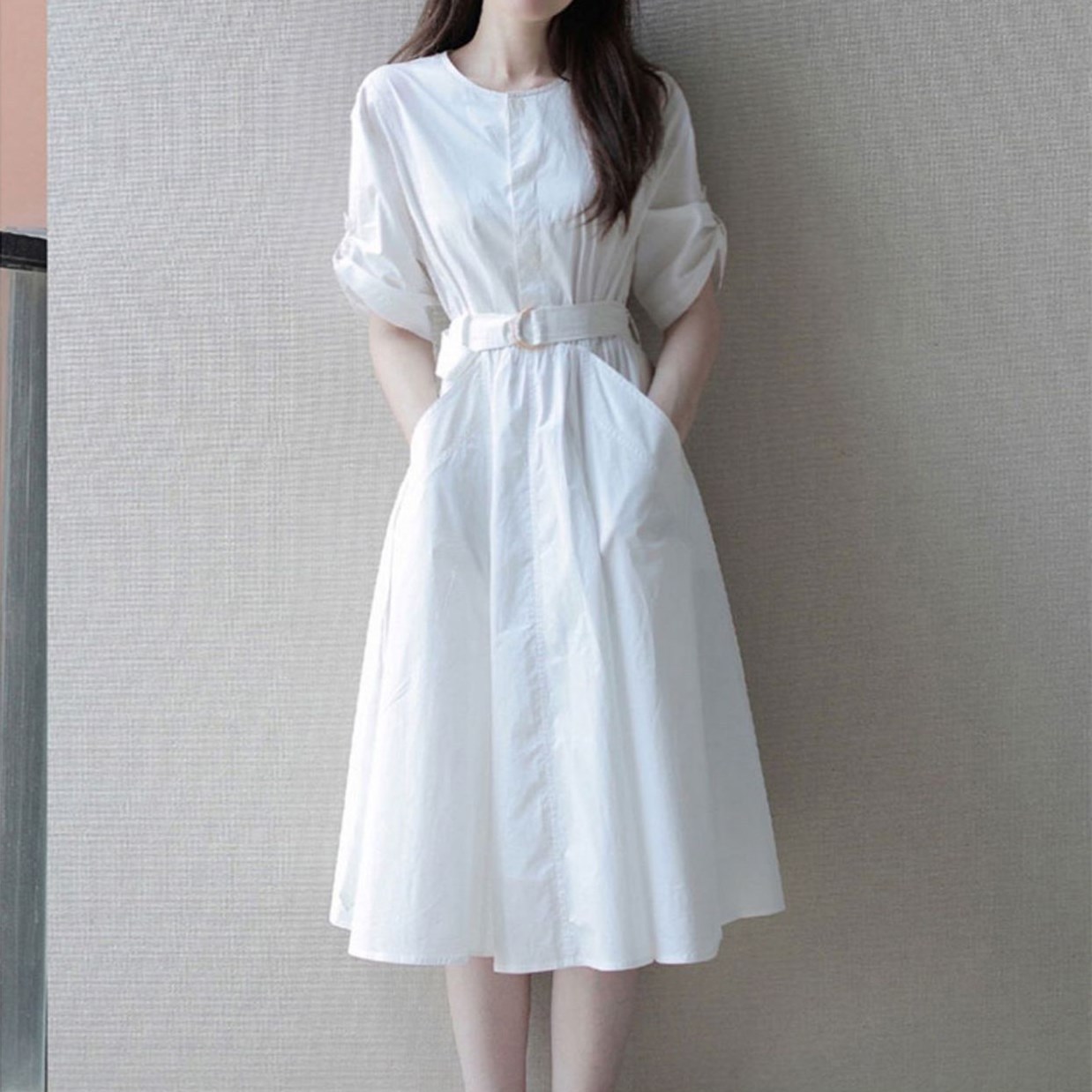 韓国のシックな春と秋の新しいスタイルのエレガントなポロカラーウエストタイ付きミッドレングスプリーツシャツドレス女性用