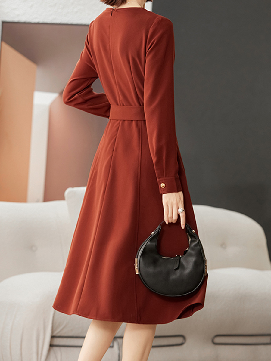 2025春秋の高級感あふれる魅力的なオレンジレッドのデザイン感のあるVネック長袖ワンピース、エレガントな通勤ファッションミディ丈ワンピース