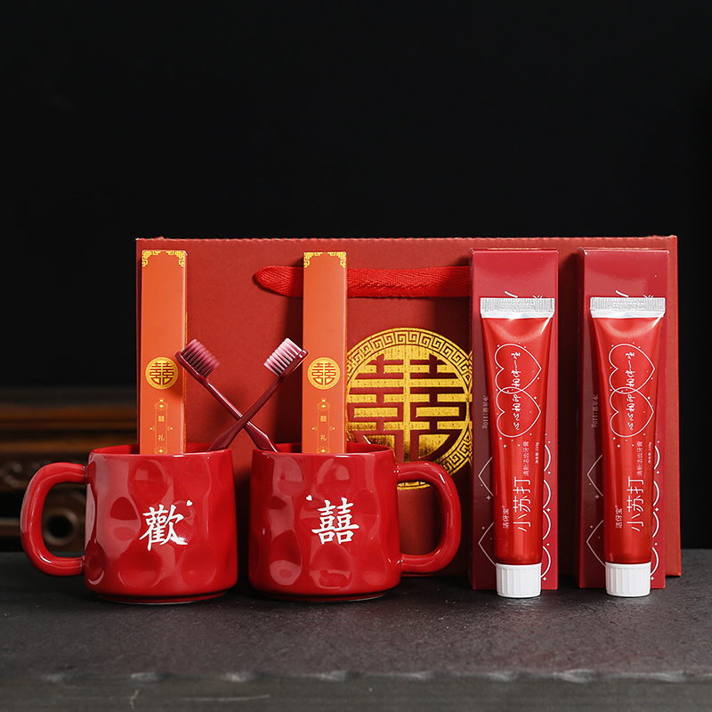 结婚洗漱杯套装一对新婚陪嫁情侣刷牙杯红色牙具陶瓷漱口杯批发