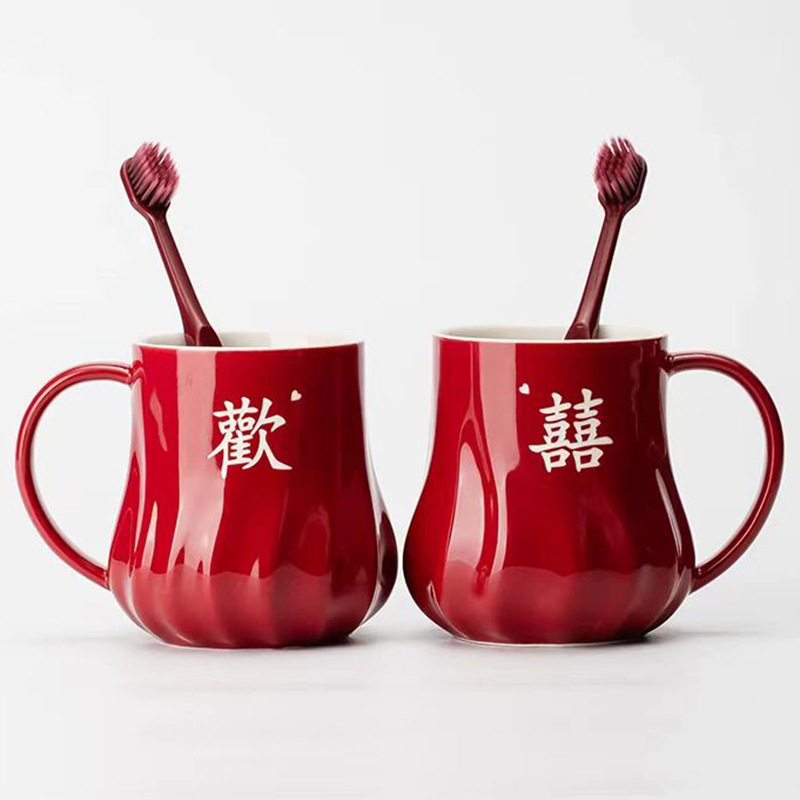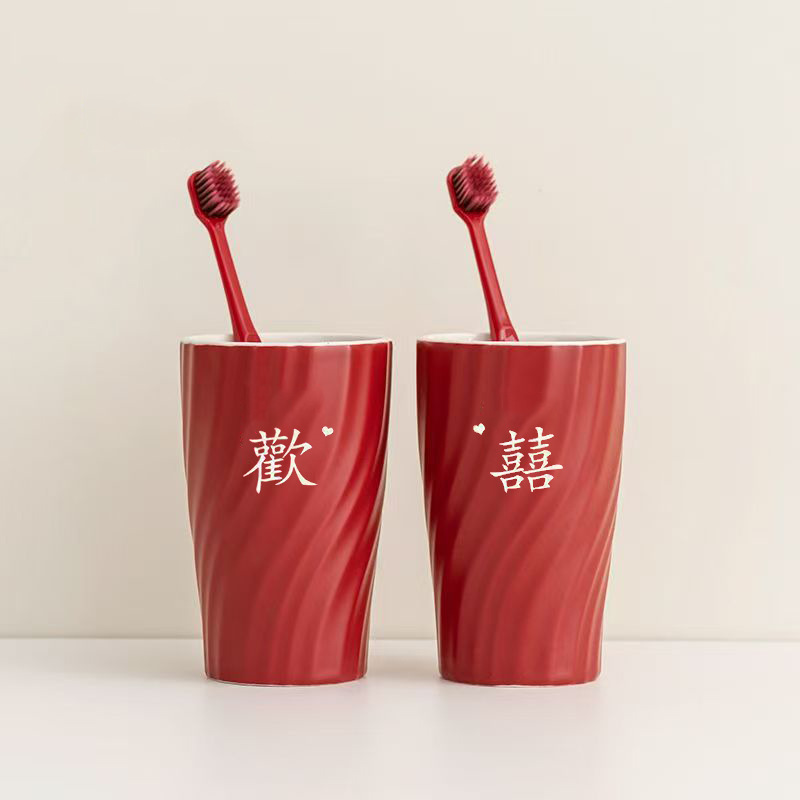 结婚洗漱杯一对漱口杯套装情侣洗漱杯子红色陶瓷牙杯牙缸新婚陪嫁