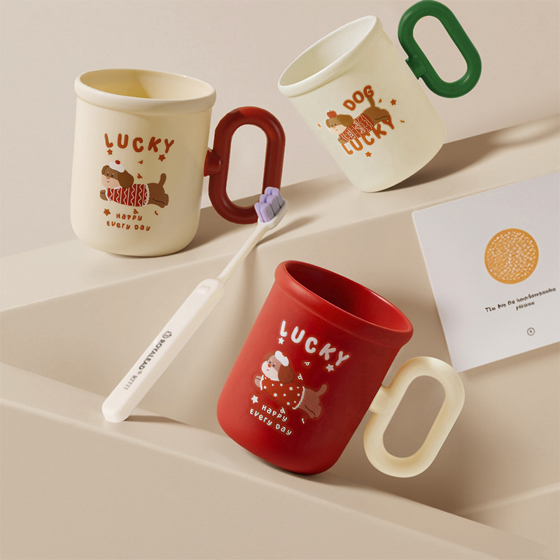 漫画の幸運な子犬のうがいの杯のお祝いの赤い子犬の家庭用の大きい取っ手のうがいの杯の歯磨きの杯の卸売り