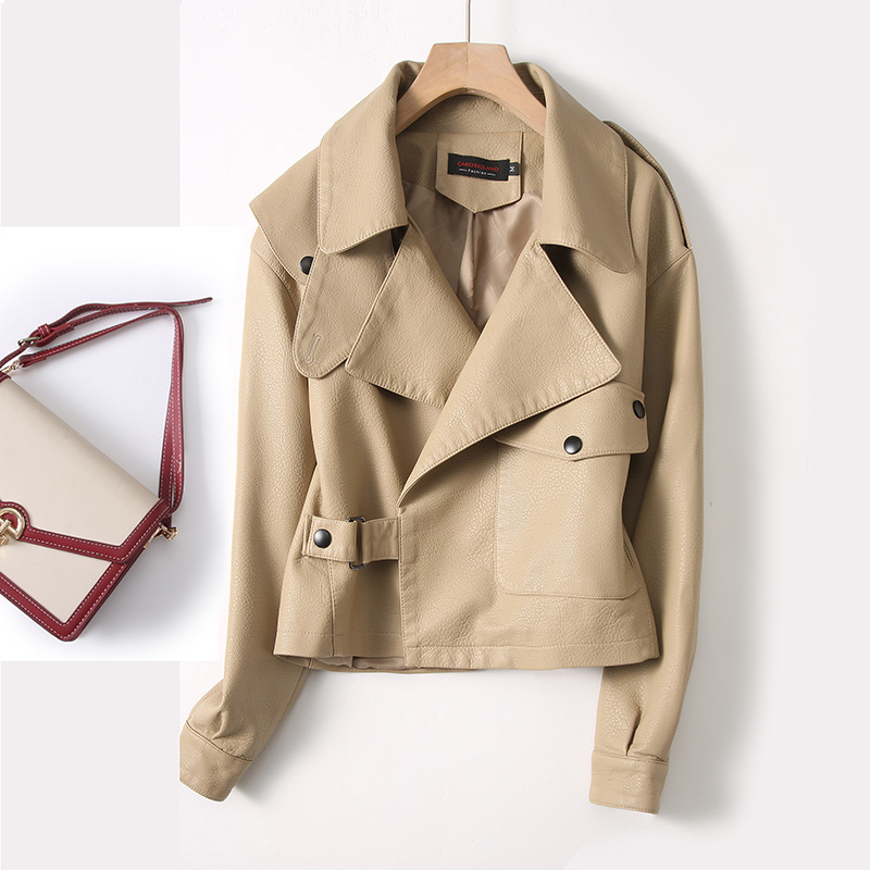 海寧綿羊皮の短い女性のコートは腰の本革の女性2025年の春と秋の新商品の韓国版の黒い皮の服の女性を結びます。