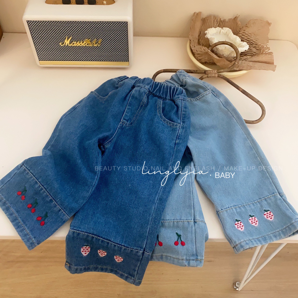 スイートキッズ 女の子用カジュアルデニムパンツ 1-7歳 秋用ベビー韓国風パンツ ストレートチェリー・ストロベリー柄ワイドパンツ