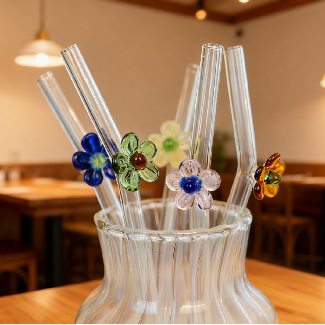 源头工厂玻璃小花弯吸管彩色小花玻璃吸管 彩色饮料奶茶玻璃吸管