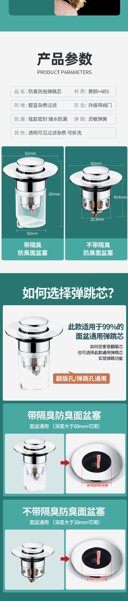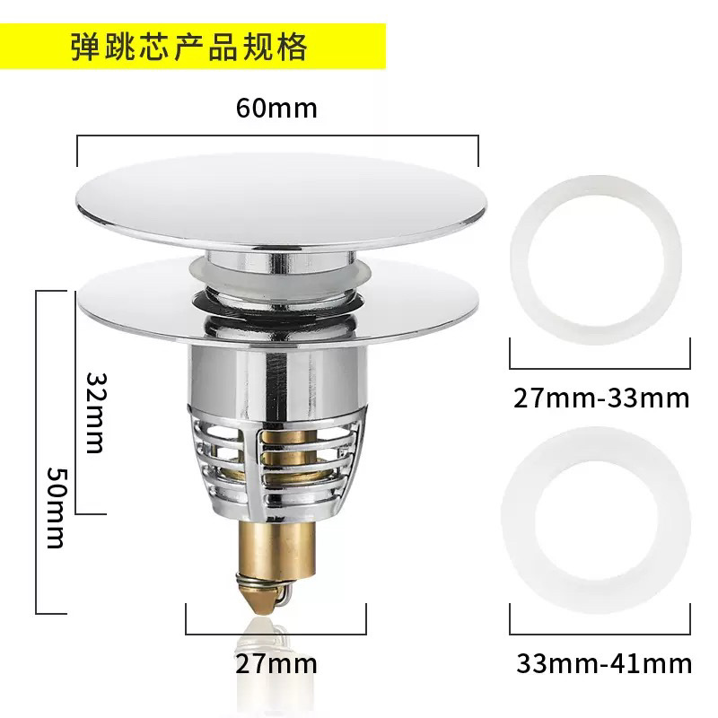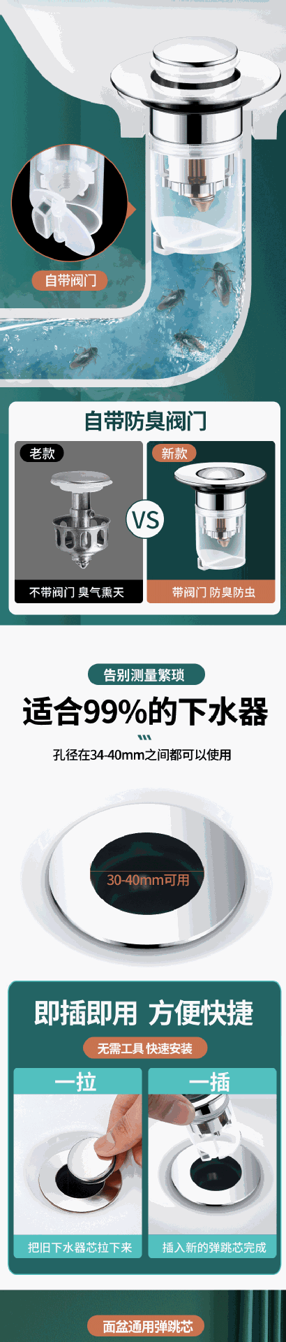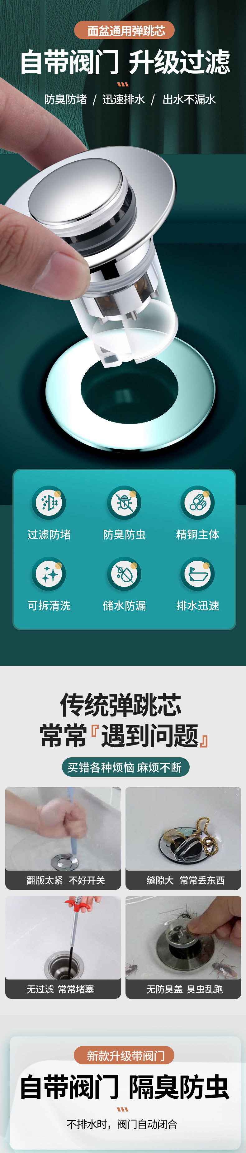 卫生间洗手盆通用防虫防臭塞下水器配件按压式过滤弹跳芯即插即用