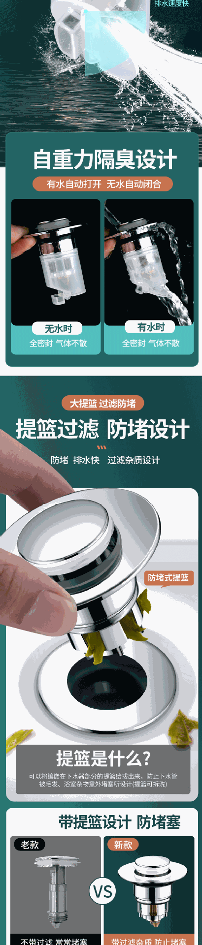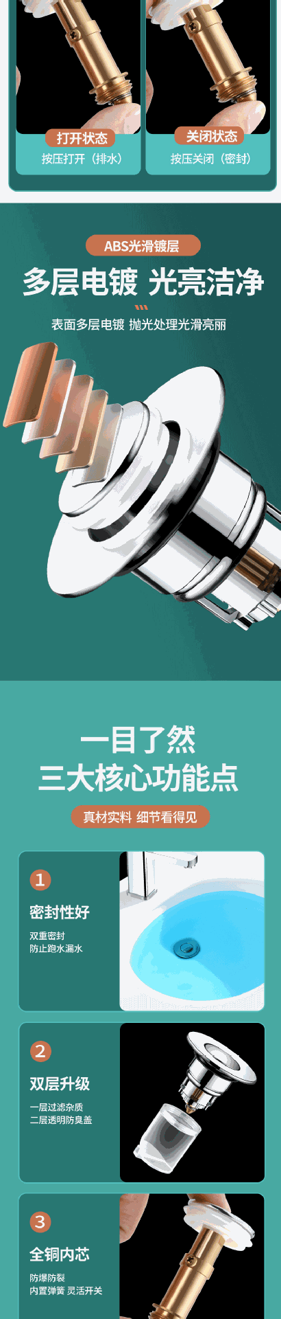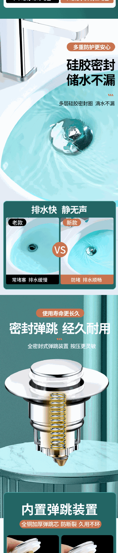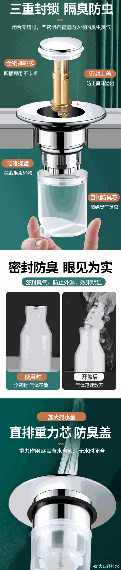 卫生间洗手盆通用防虫防臭塞下水器配件按压式过滤弹跳芯即插即用