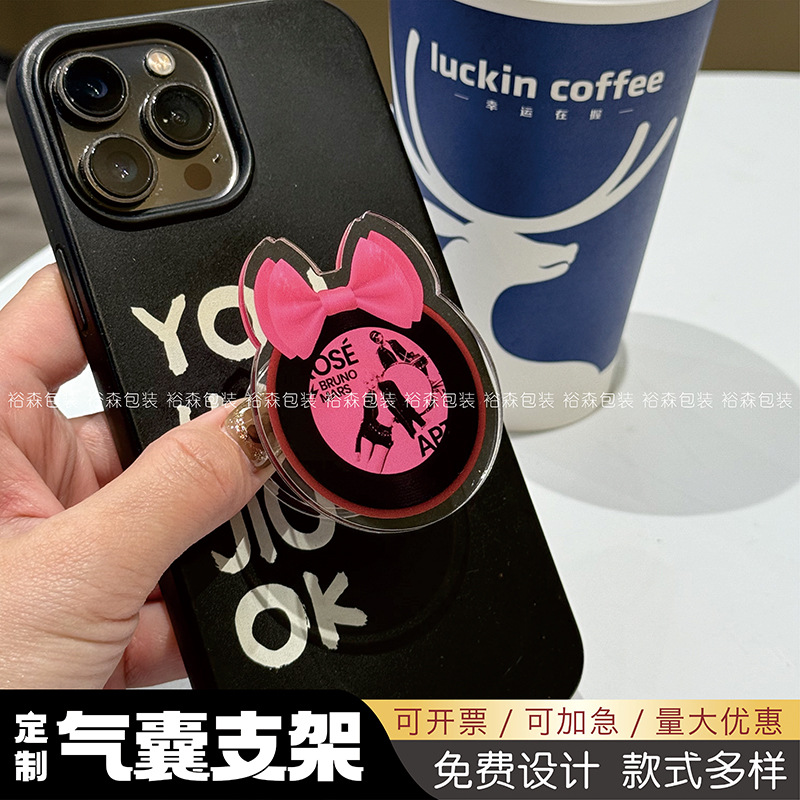 アクリル携帯電話エアバッグスタンドの赤ちゃんペットの顔がゴムを垂らして支えているスタンドが伸縮しています。