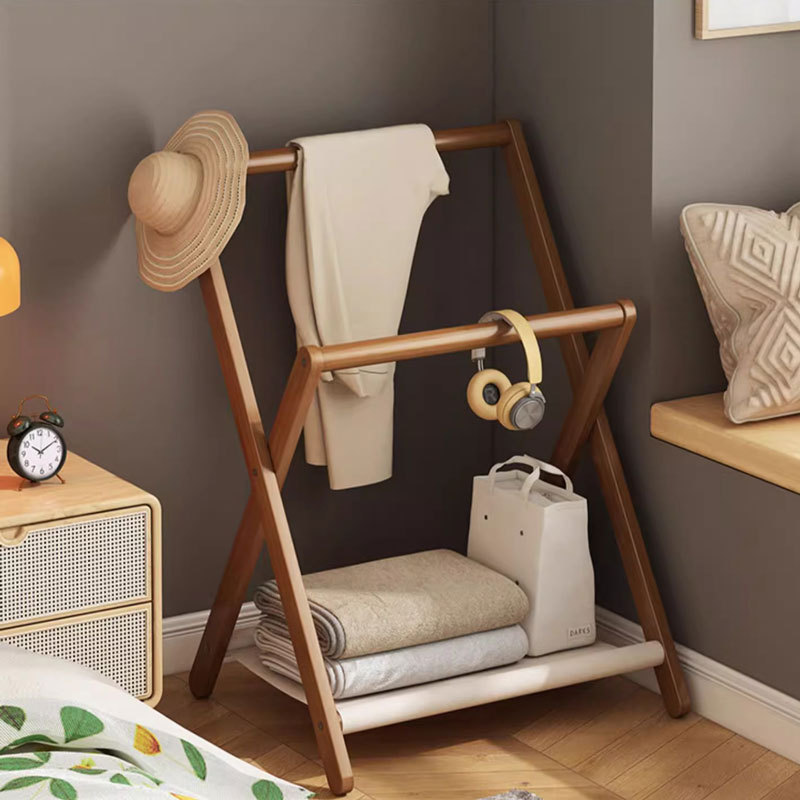 床头衣帽架落地卧室简易家用可折叠双杆衣服收纳置物架实木挂衣架